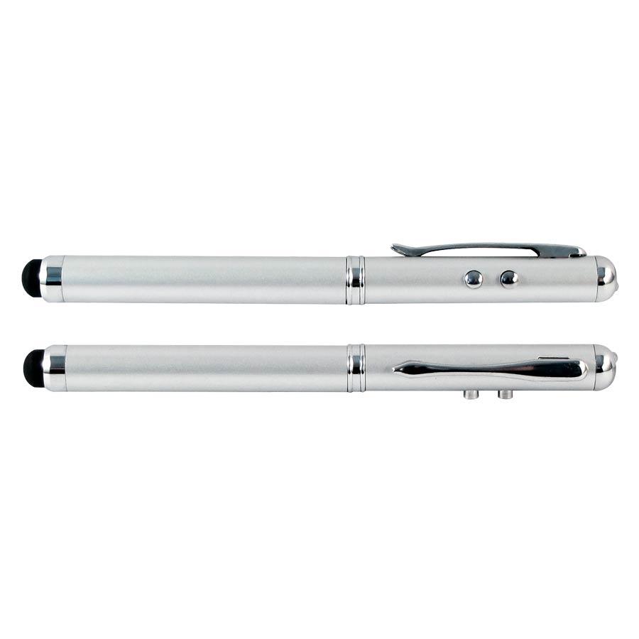Bolígrafo metálico multi-función 4 en 1. Incluye bolígrafo, linterna LED, puntero láser y NUEVO puntero "Touch-screen" para pantallas táctiles. Presentación en estuche de aluminio. Escritura Azul.