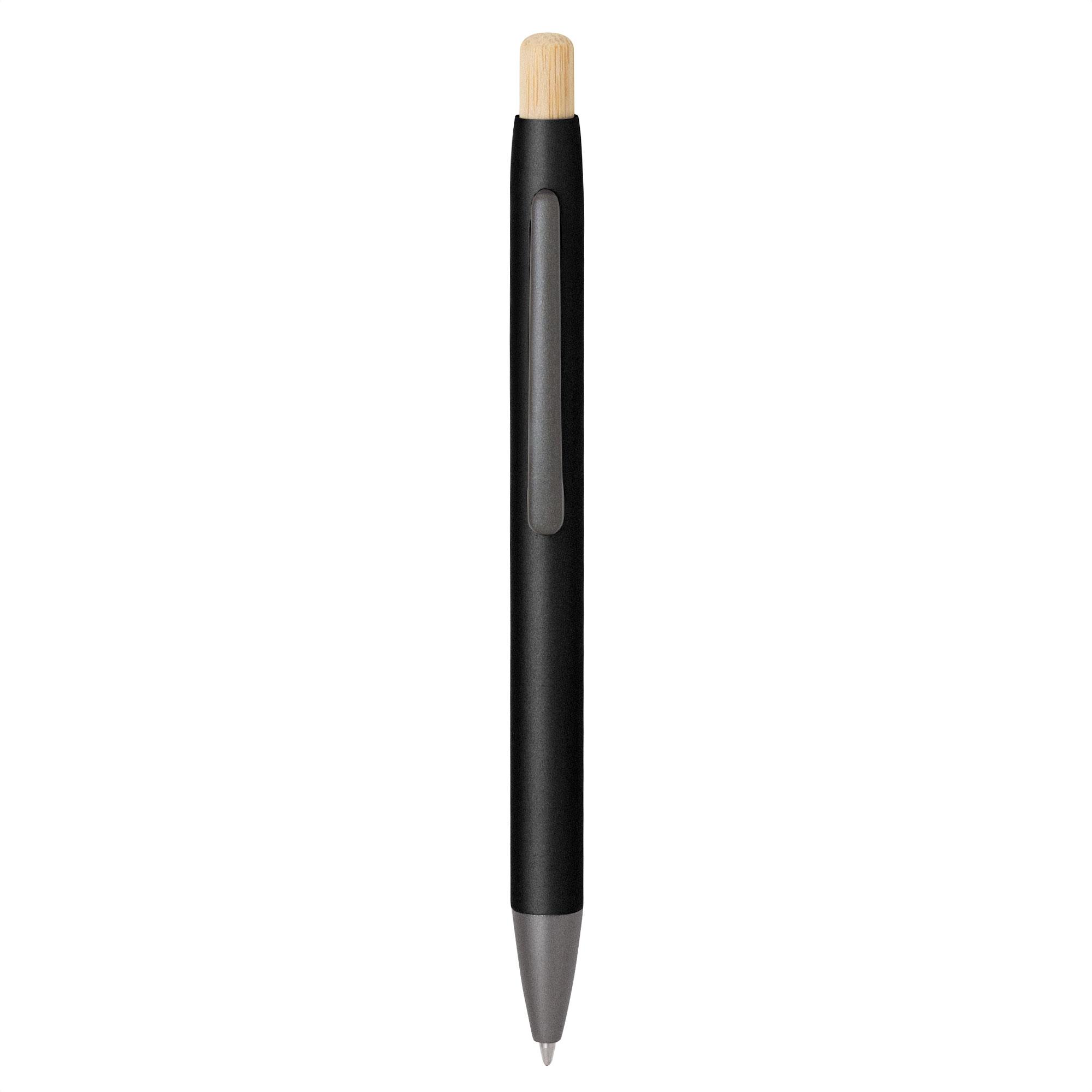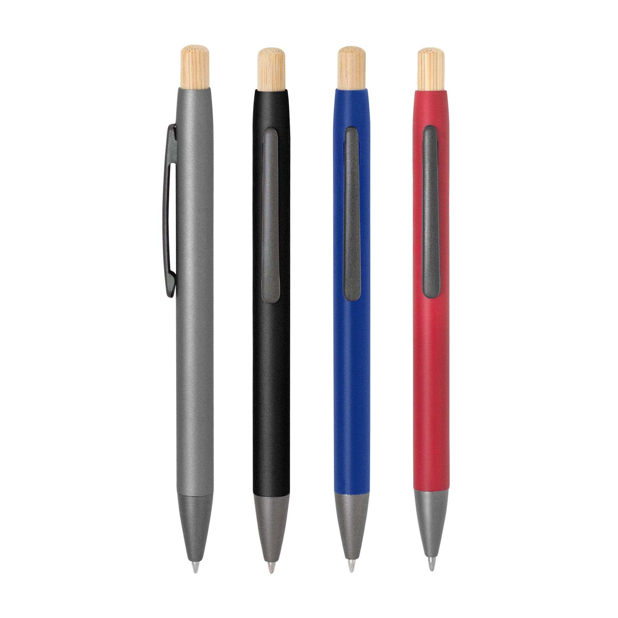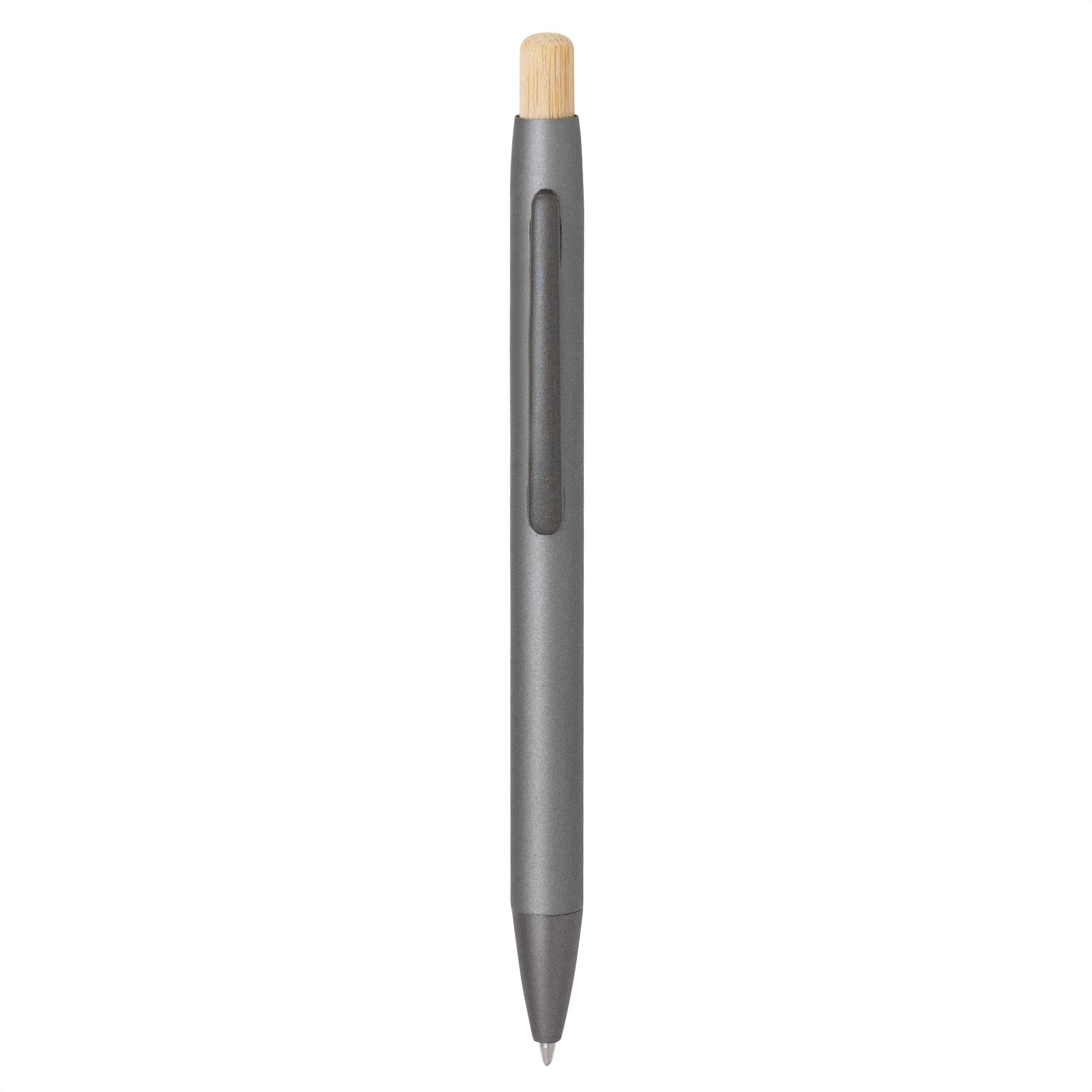 - Clip metálico, puntera plástica color gris y pulsador de bambú.