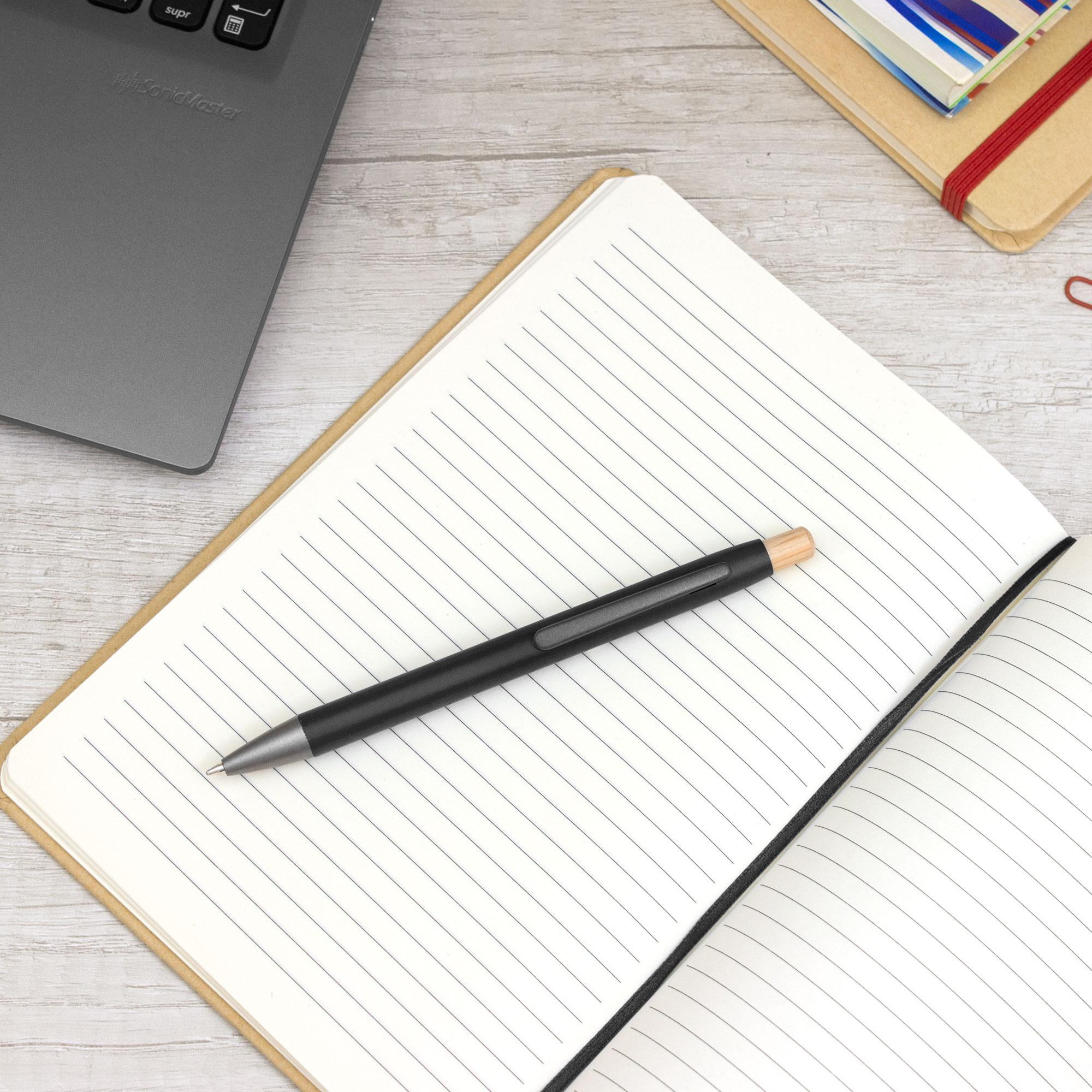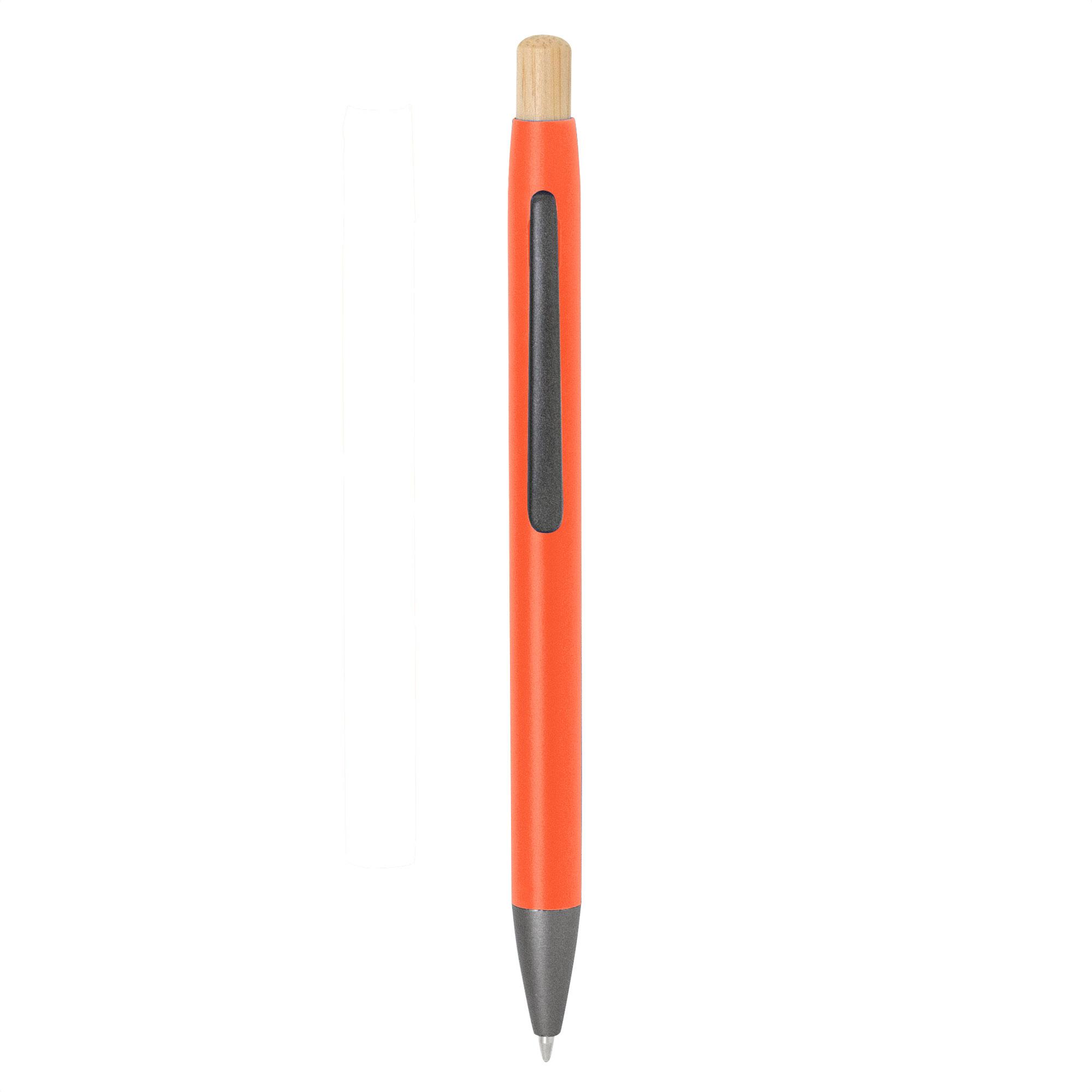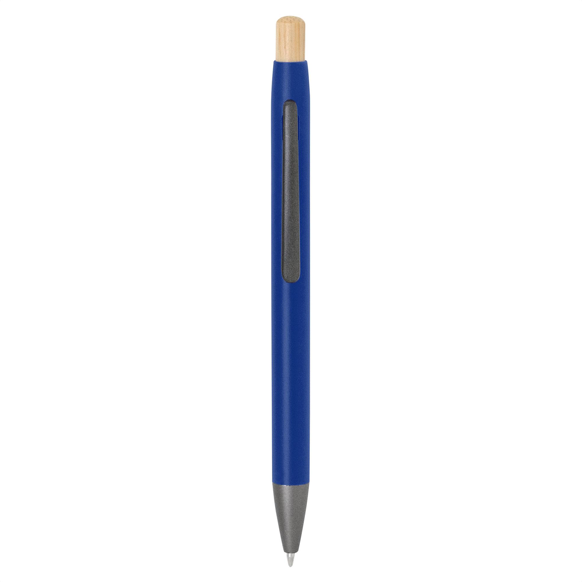 - Clip metálico, puntera plástica color gris y pulsador de bambú.