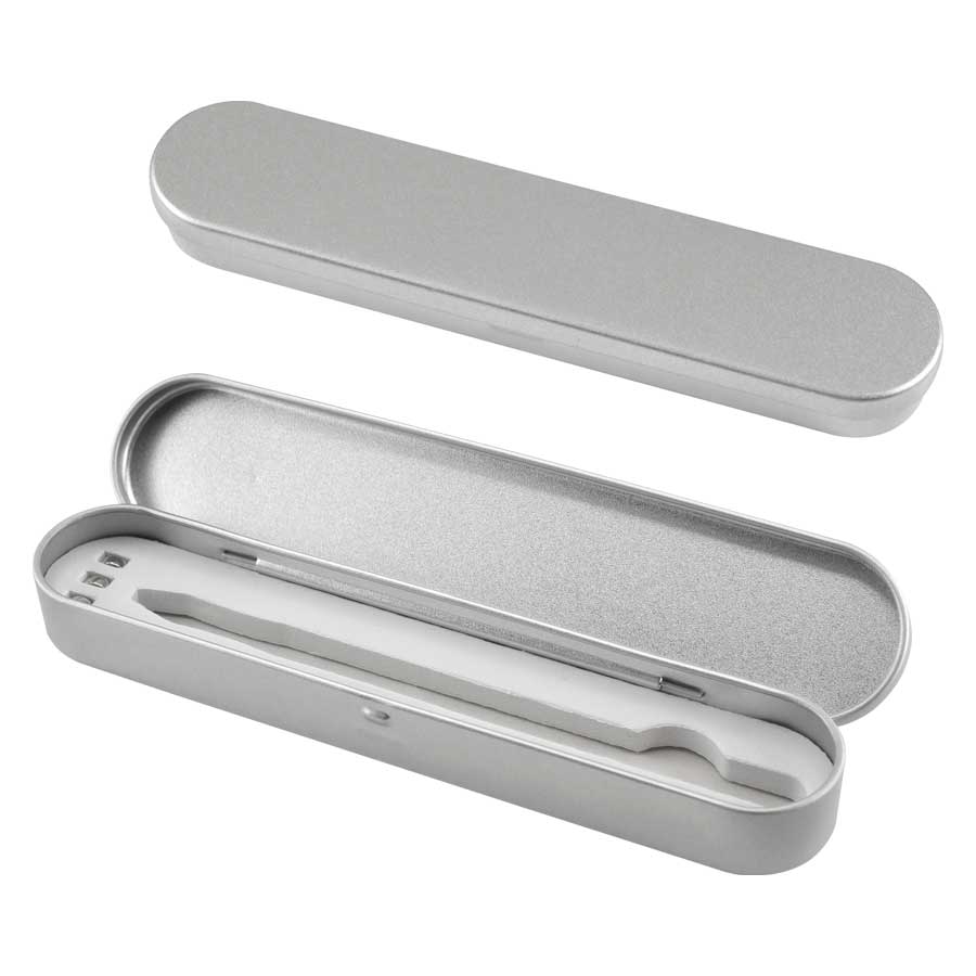 Bolígrafo metálico multi-función 4 en 1. Incluye bolígrafo, linterna LED, puntero láser y puntero PDA (Palm). Presentación en estuche de aluminio. Escritura Azul.