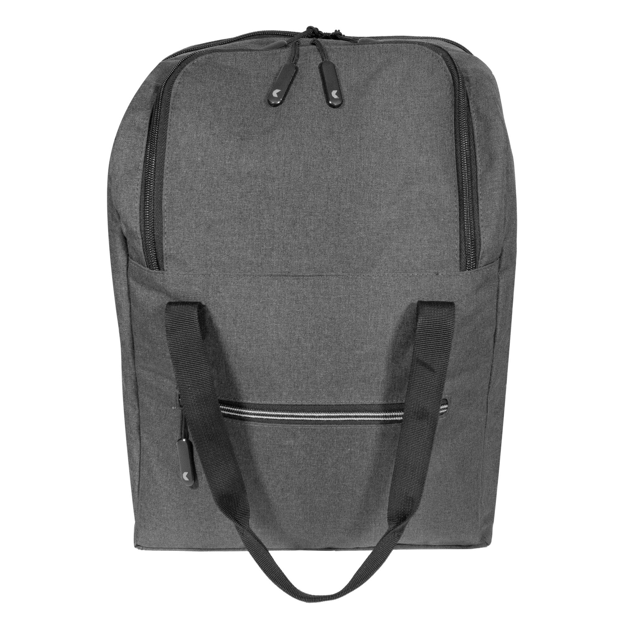 - La parte trasera cuenta con tiras regulables con hebillas plásticas y en la parte superior dos tiras con cierre a presión que lo convierten en bolso de mano.