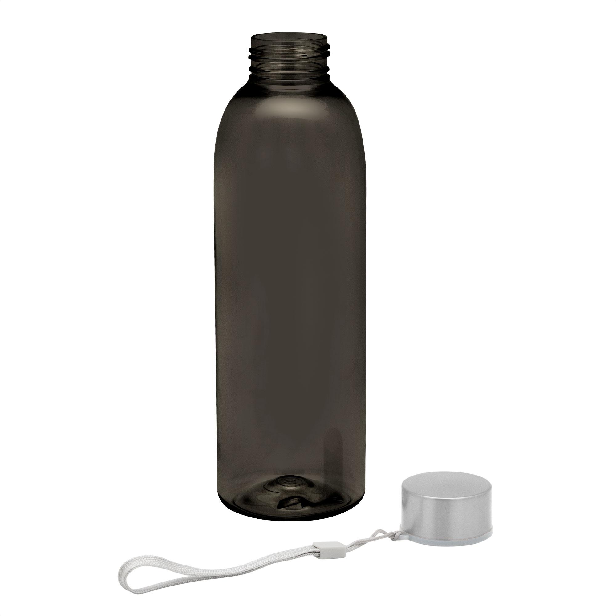 - Botella de color translúcido con tapa a rosca de acero inoxidable, anillo de silicona antiderrame y correa para transportar.