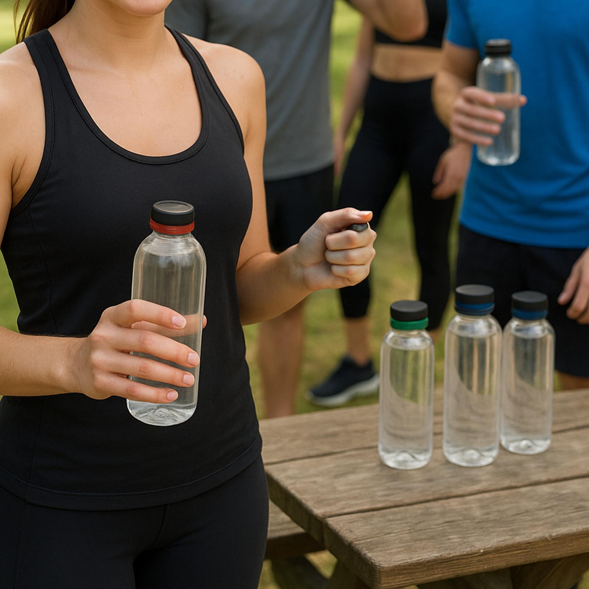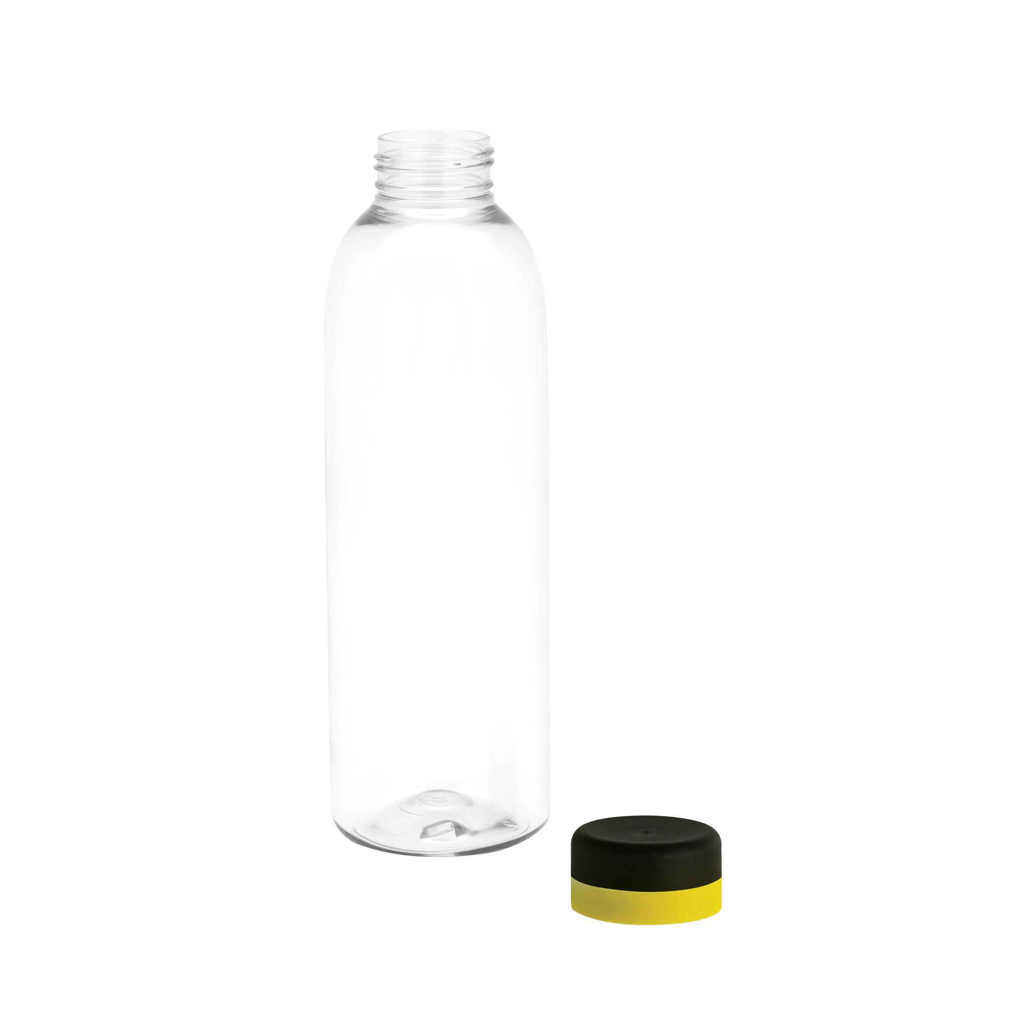 - Botella de plástico transparente con tapa a rosca color negro mate con anillo de silicona de diferentes colores.