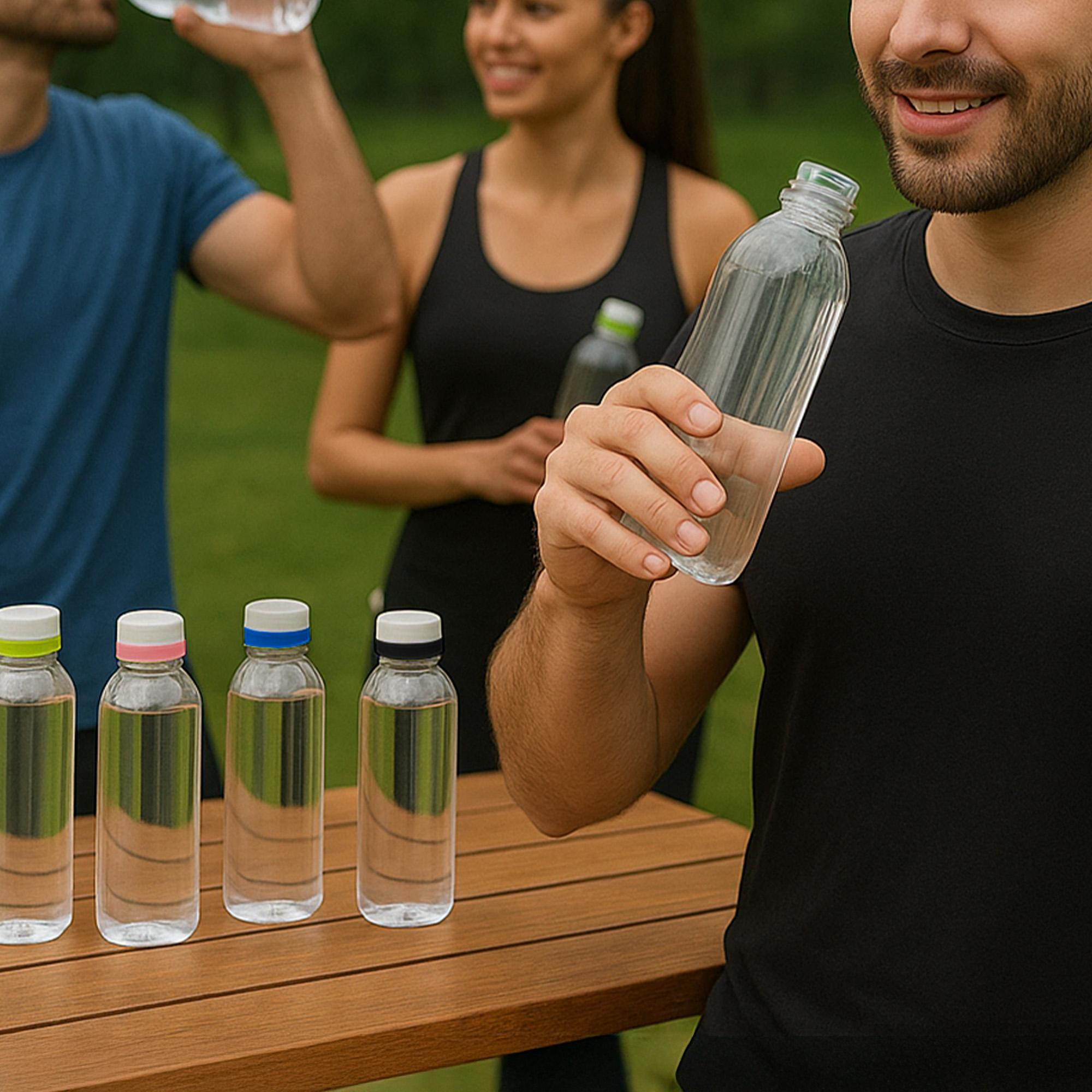 - Botella de plástico transparente con tapa a rosca color blanco mate con anillo de silicona de diferentes colores.