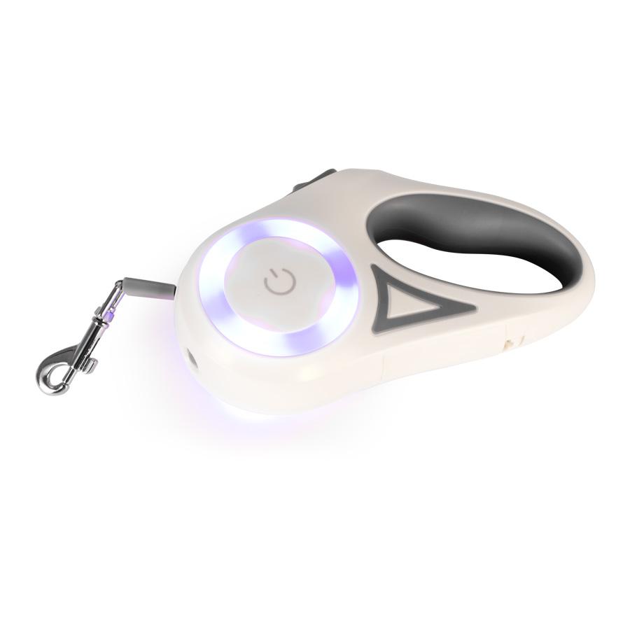 Correa extensible de 3mts para mascota, en plástico ABS blanco con detalles grises y correa de nylon color gris con sistema de traba. Contiene una linterna LED luz blanca + juego de luces LED de colores en círculo central. Usa 2 pilas AAA (no incluídas). Presentación en caja de cartón blanco de regalo.