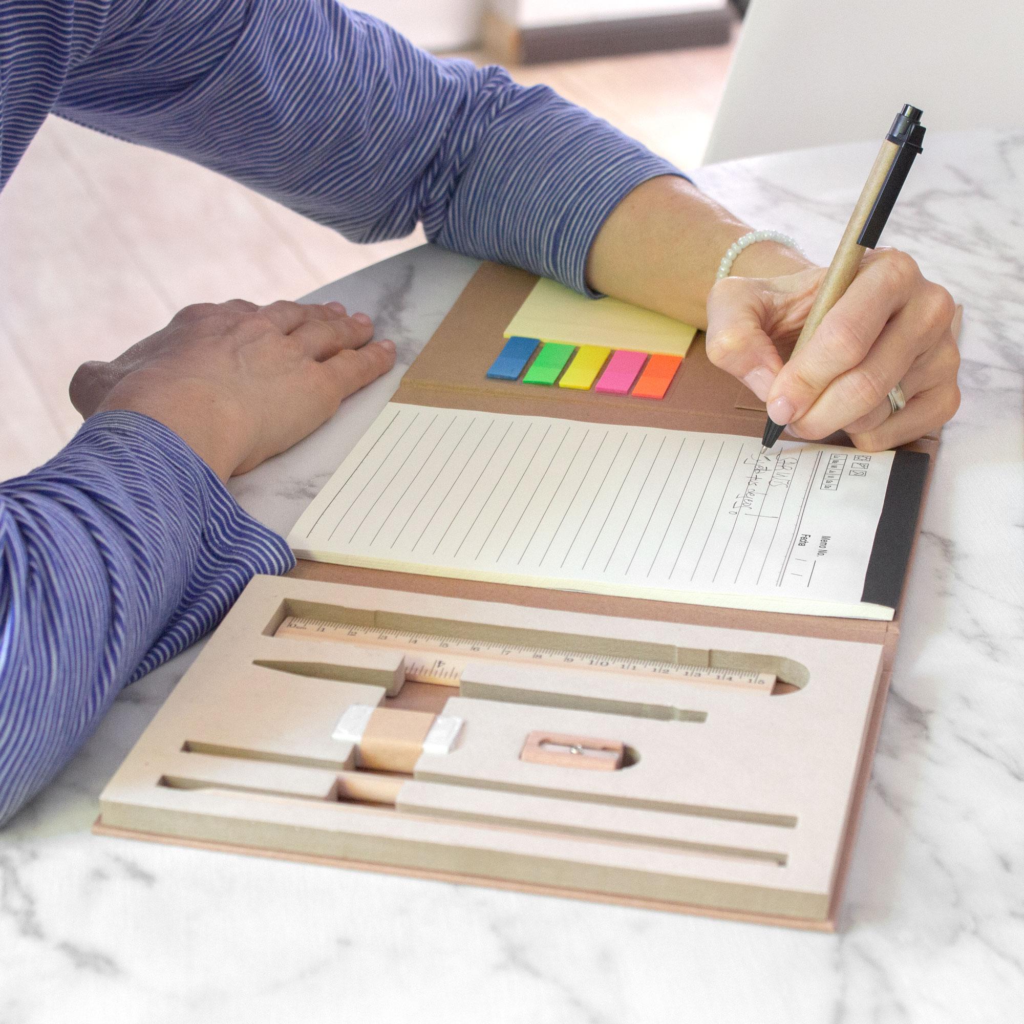 - El kit contiene: un bloc de hojas rayadas con fecha y dia de la semana, regla de madera, regla de pvc, dos lápices negros, goma de borrar, sacapuntas y bolígrafo tinta negra.