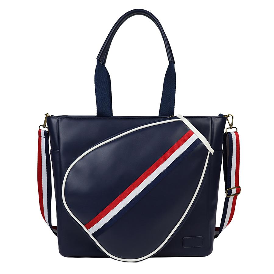 Deluxe Bolso deportivo "Padel" en elegante Eco-Cuero con detalles. Contiene tiradores con forma de pala de padel y compartimento delantero para pala de padel. Finas terminaciones, un bolso de lujo para los jugadores de padel.
