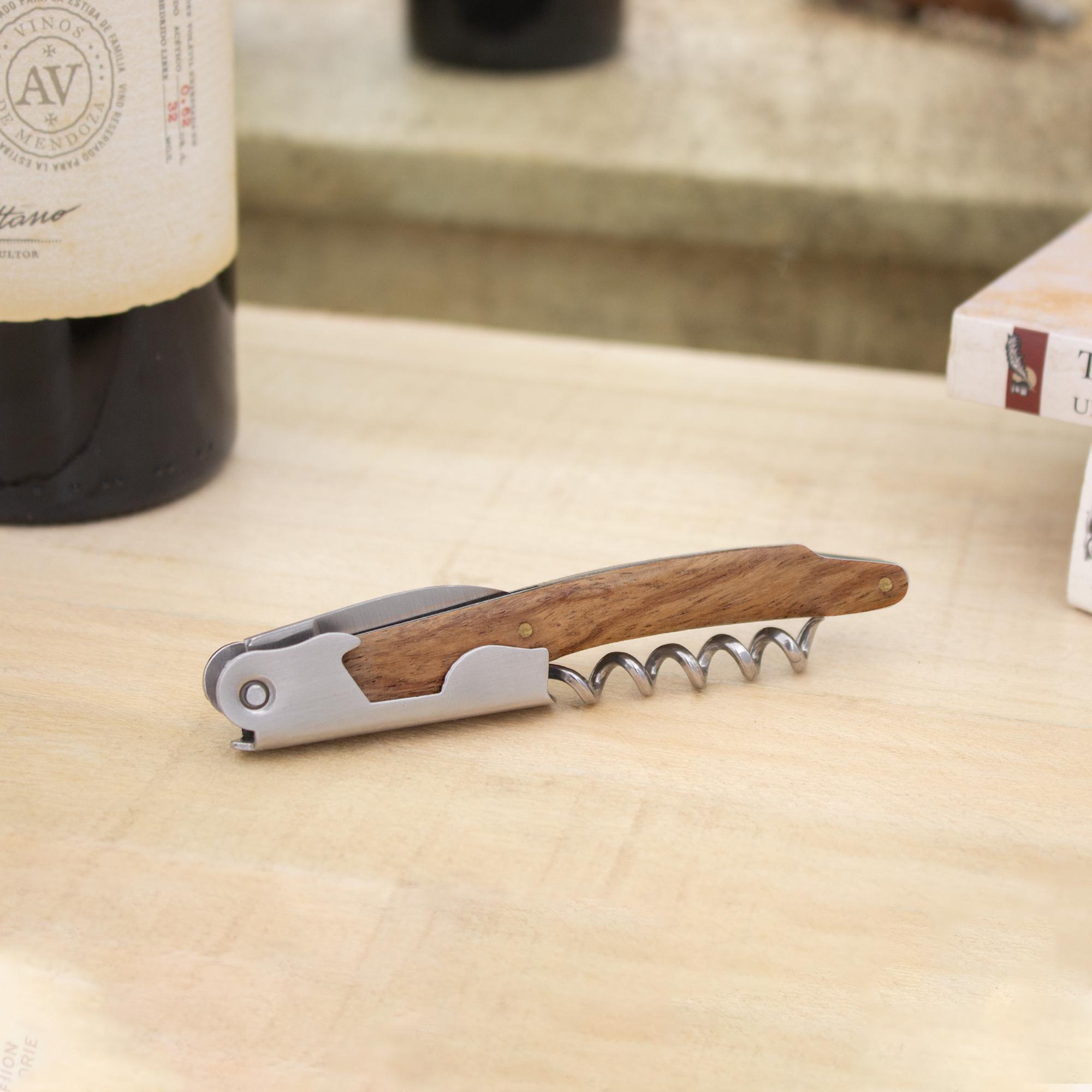 - Abridor de botellas de vino en acero inoxidable con mango de madera en color natural.