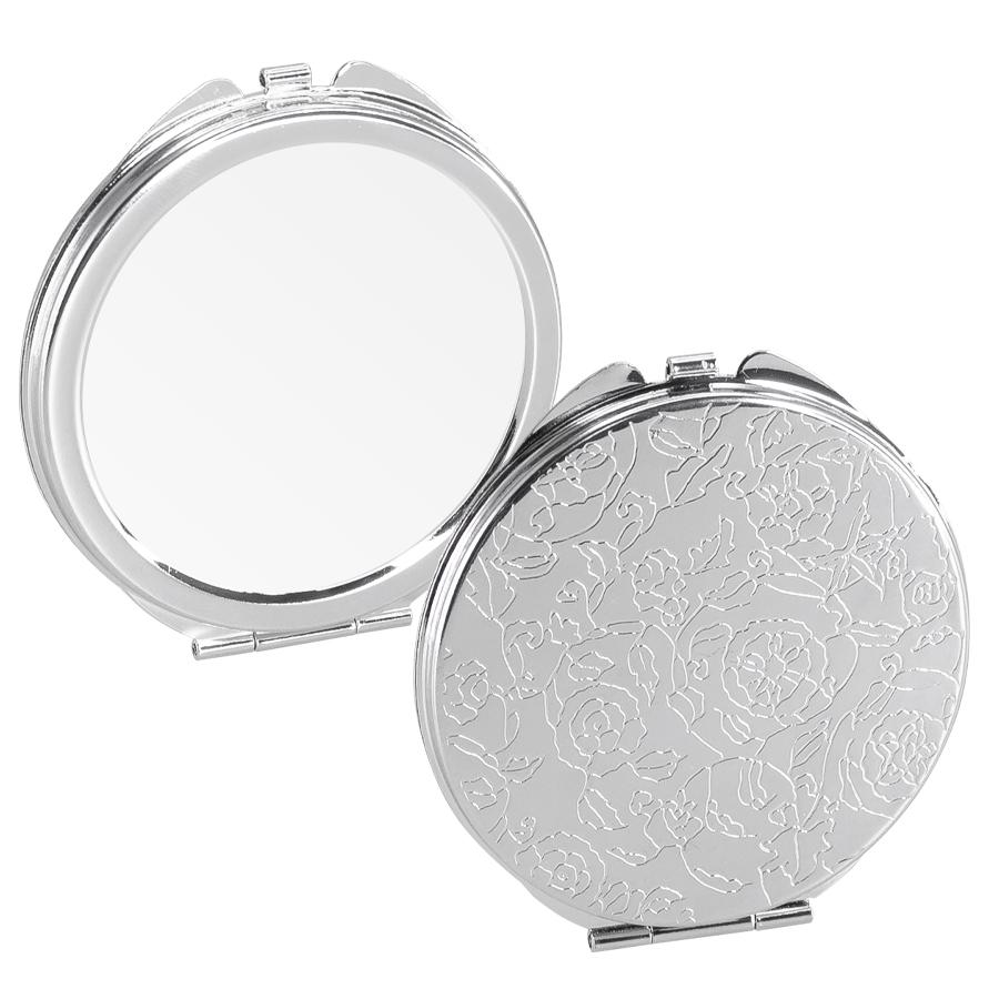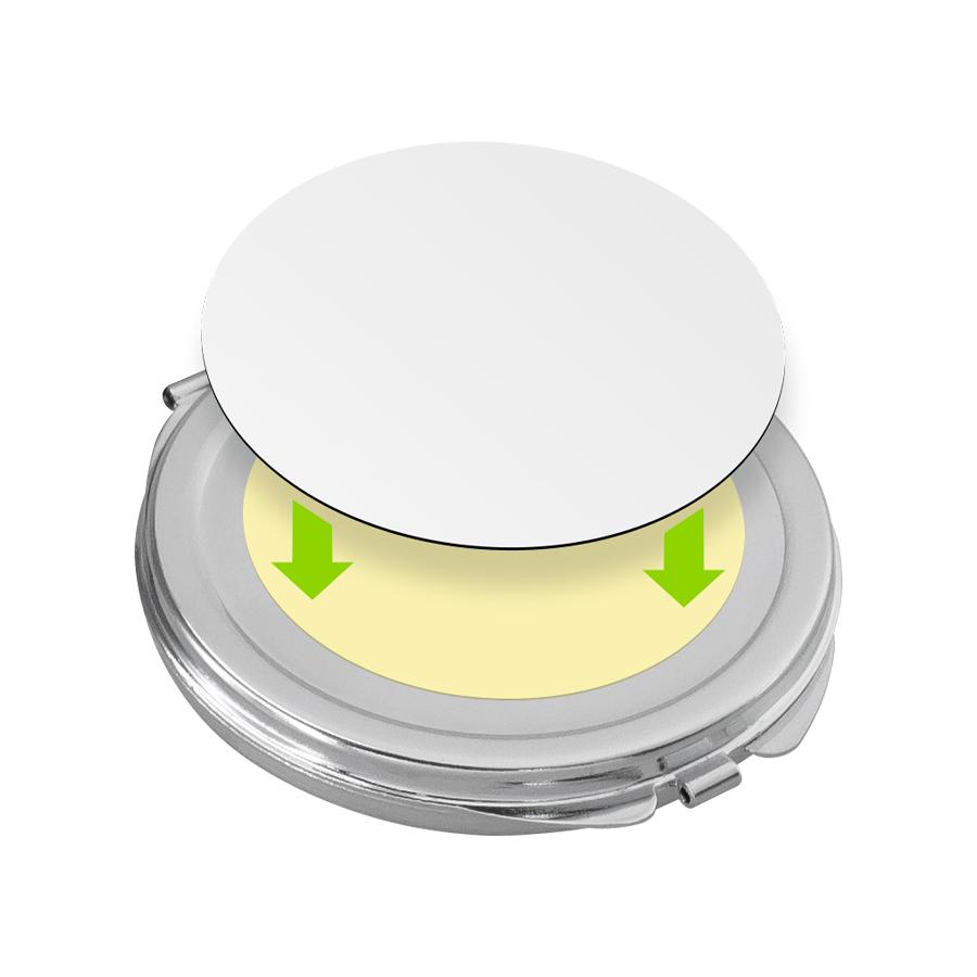 Espejo metálico redondo doble, con tapa, con círculo para Sublimación. Presentación en caja laminada blanca.
