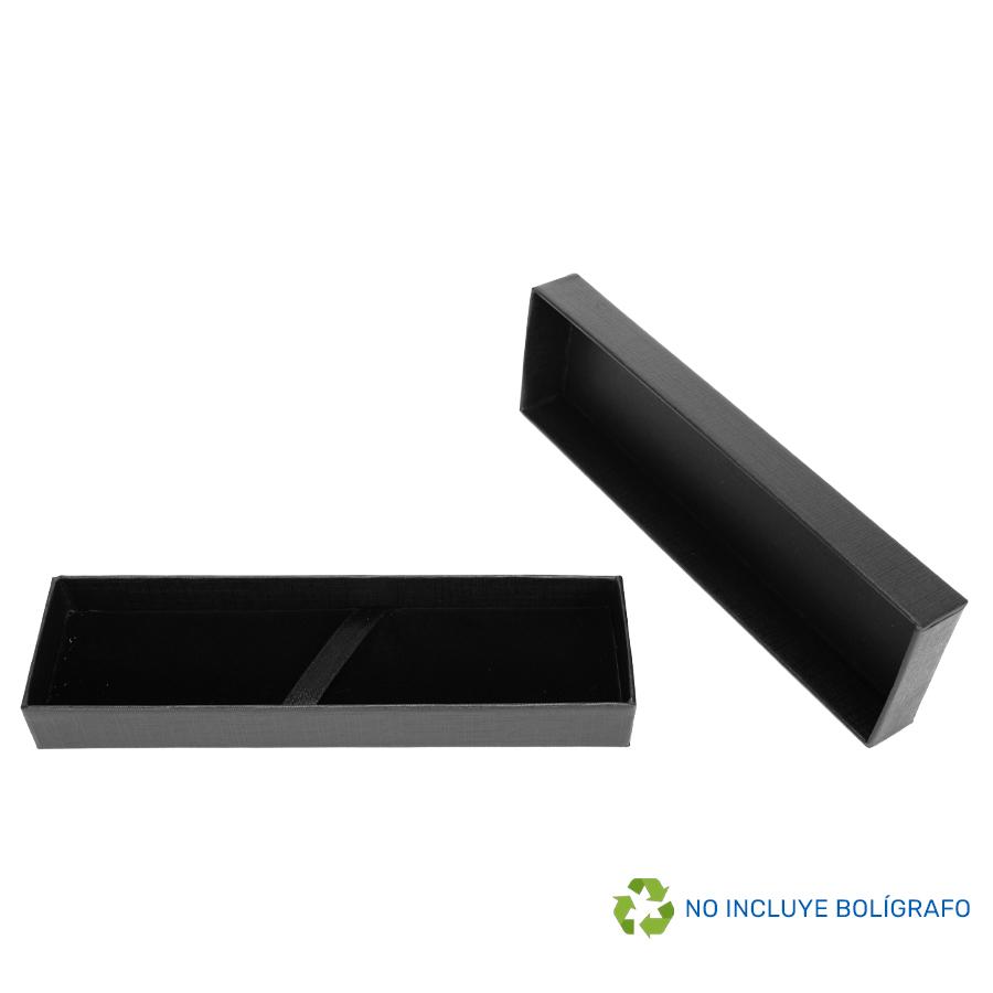 Estuche rectangular Porta-Bolígrafo ejecutivo modelo "Taurus", con tapa. Fabricado en cartón forrado color negro, con base interior acolchada en tela negra afelpada y cinta sujeta-bolígrafo de poliéster. 100% color negro.