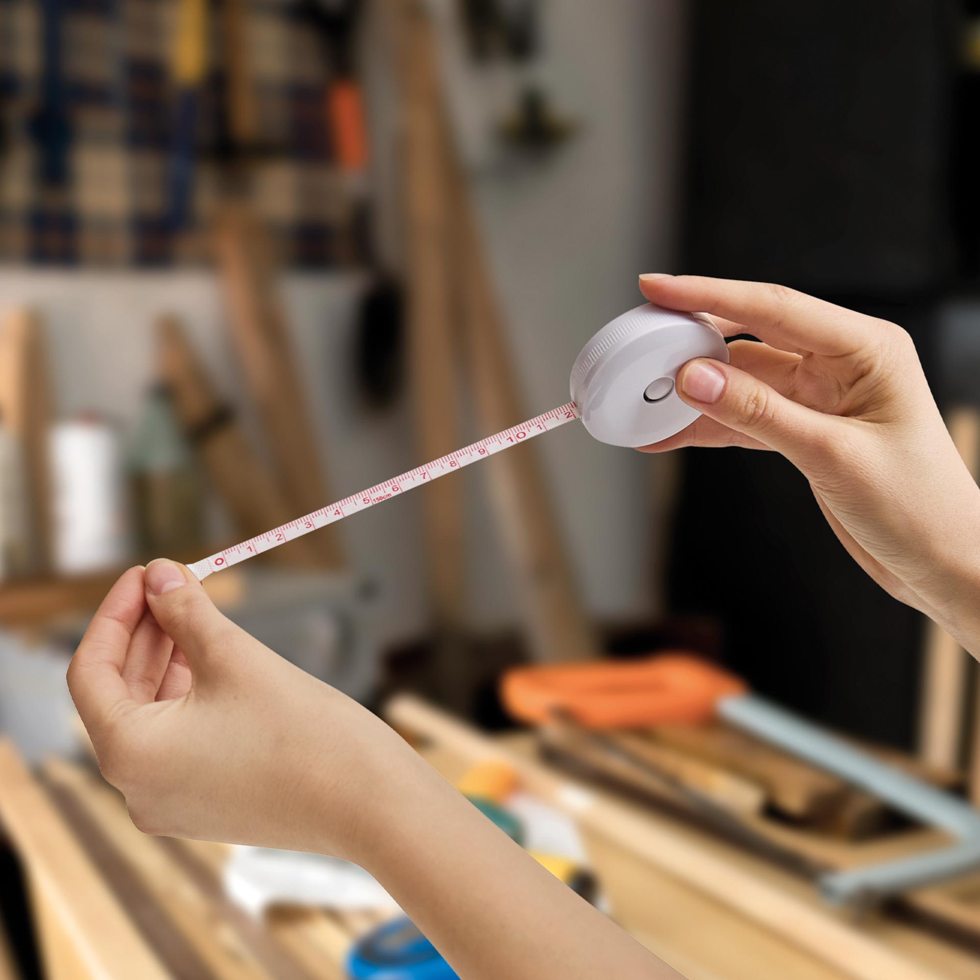 - Plástico. con botón de bloqueo que permite marcar medida y liberar cinta.