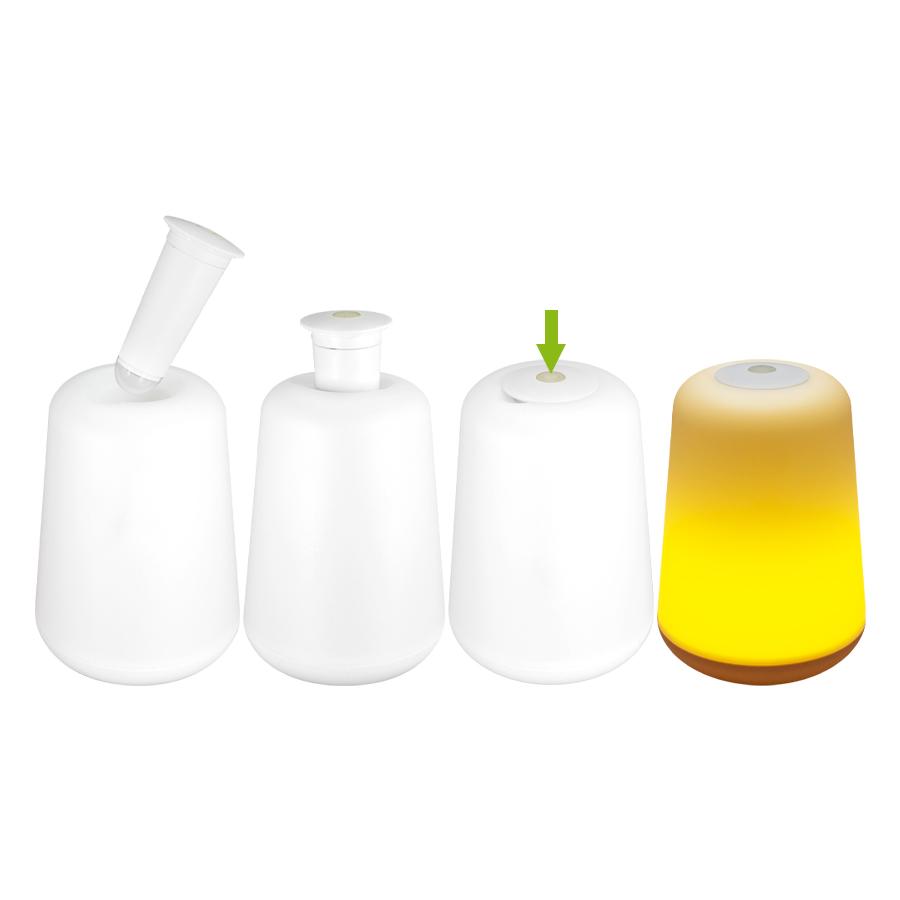 Lámpara de sobremesa de luz cálida amarilla, con luz LED removible. Usa 3 pilas AAA (no incluidas). Gran superficie de impresión. Presentación en caja de regalo de cartón blanco.
