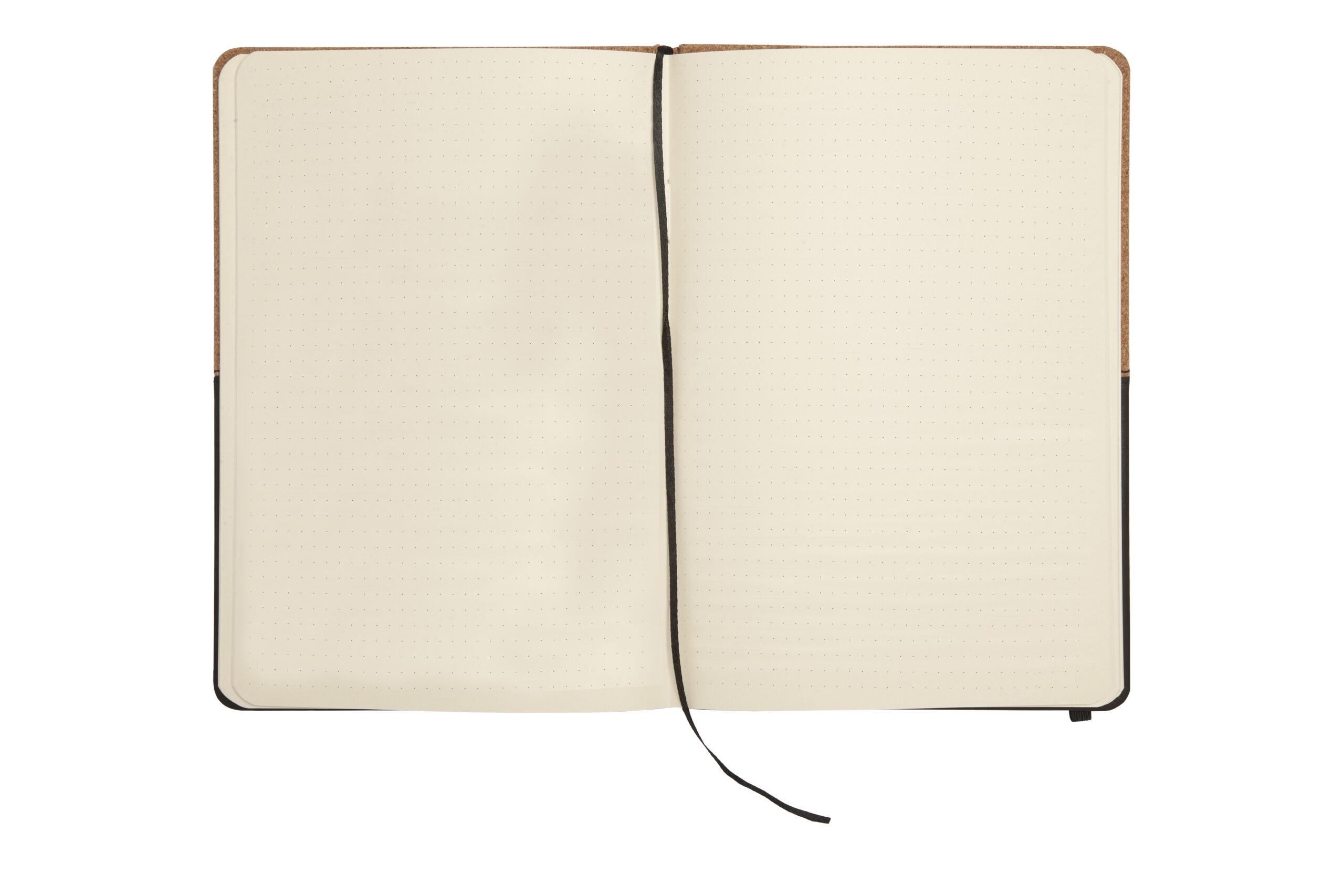 Tamaño: 21 x 14,2 x 1,3 cm (cerrado) 21 x 28 x 1,3 cm. (abierta) Libreta de símil corcho y PU con detalle de costura. 80 hojas con renglones punteados, señalador de tela y elástico de.