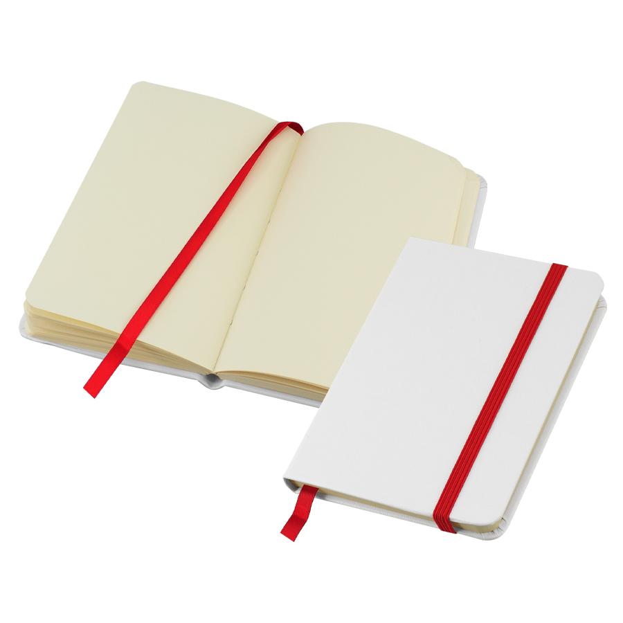 Libreta modelo "Whiteskine" tamaño A6, con cubierta de cartón piedra forrada en PU simil cuero blanco de 1.5mm de espesor. Interior 80 hojas limpias amarillas de 80gsm. Incluye banda elástica y huincha separador de hojas de color. Presentación individual en bolsa de polipropileno.