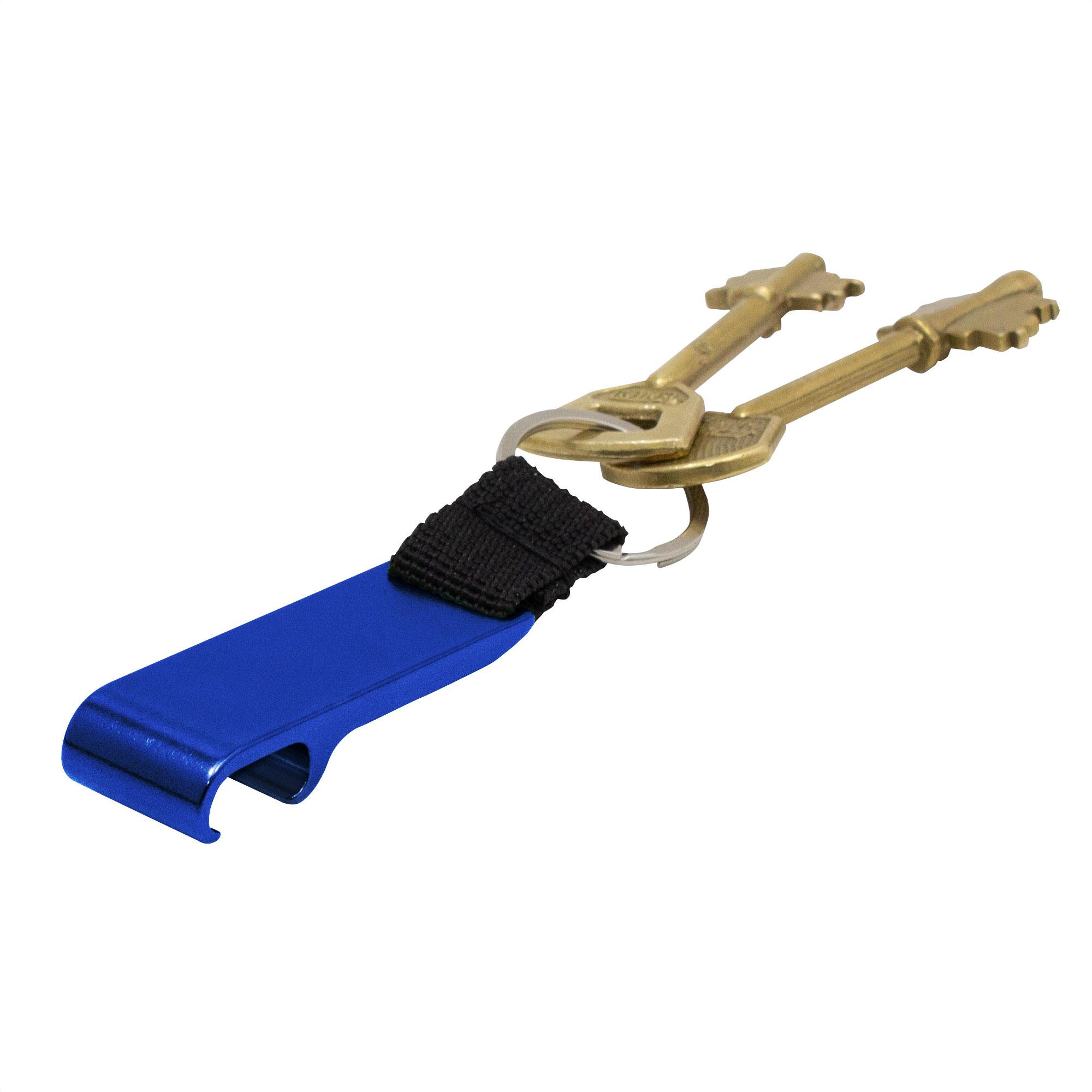 - Llavero destapador con correa de poliester color negro de 2.5 x 1.5cm.