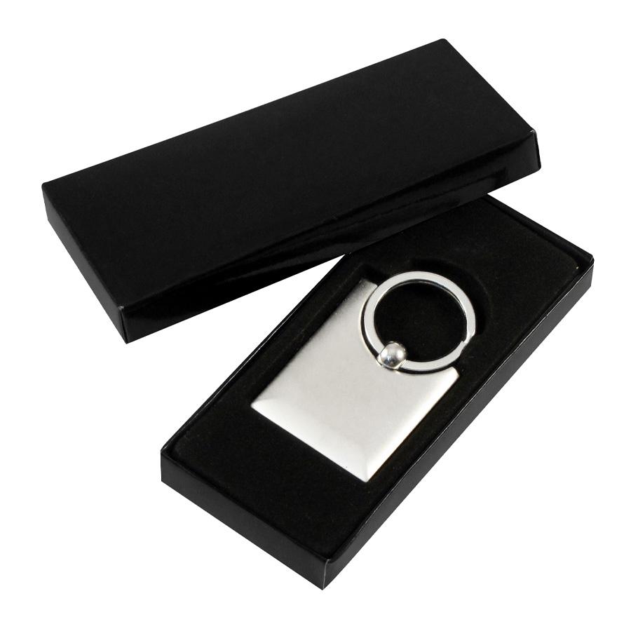 Llavero Metálico satinado, modelo "Bag". Presentación en estuche laminado negro con cuna aterciopelada.