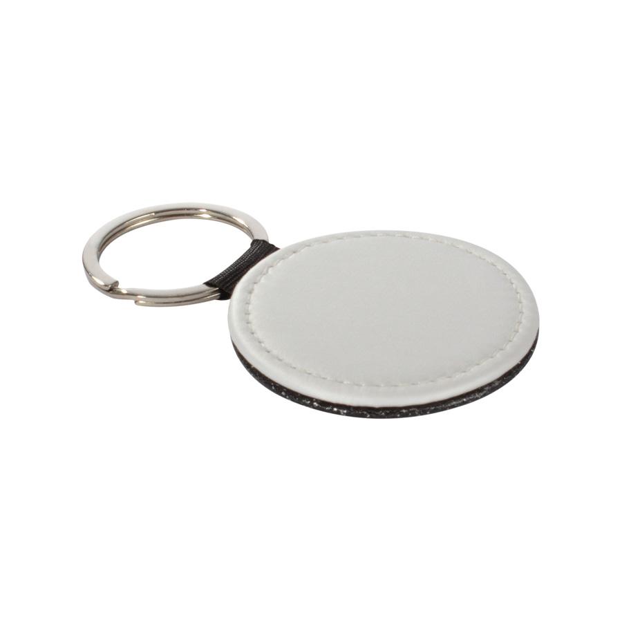 Llavero redondo de PU blanco para sublimación. Reverso capa PU negro con brillo (no sublimable). Argolla de Acero inoxidable.