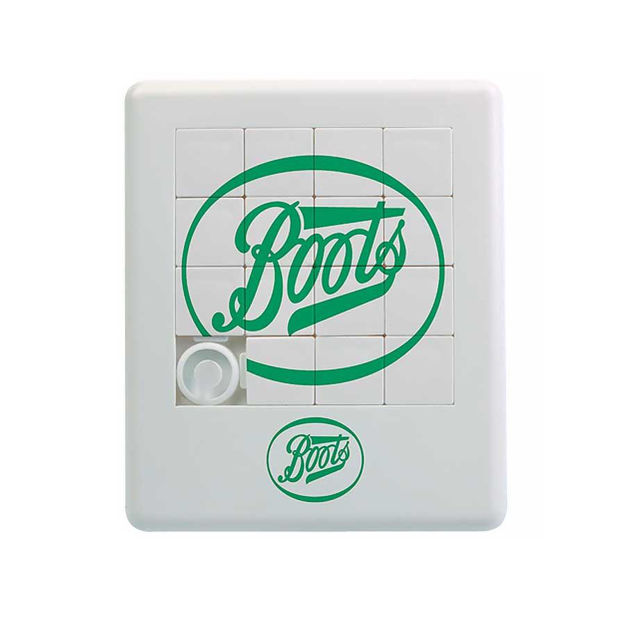 Mini-puzzle plástico. Permite impresión sobre las piezas cuadradas y el objetivo es desordenarlas para luego ordenarlas y así formar el logo o figura impresa.