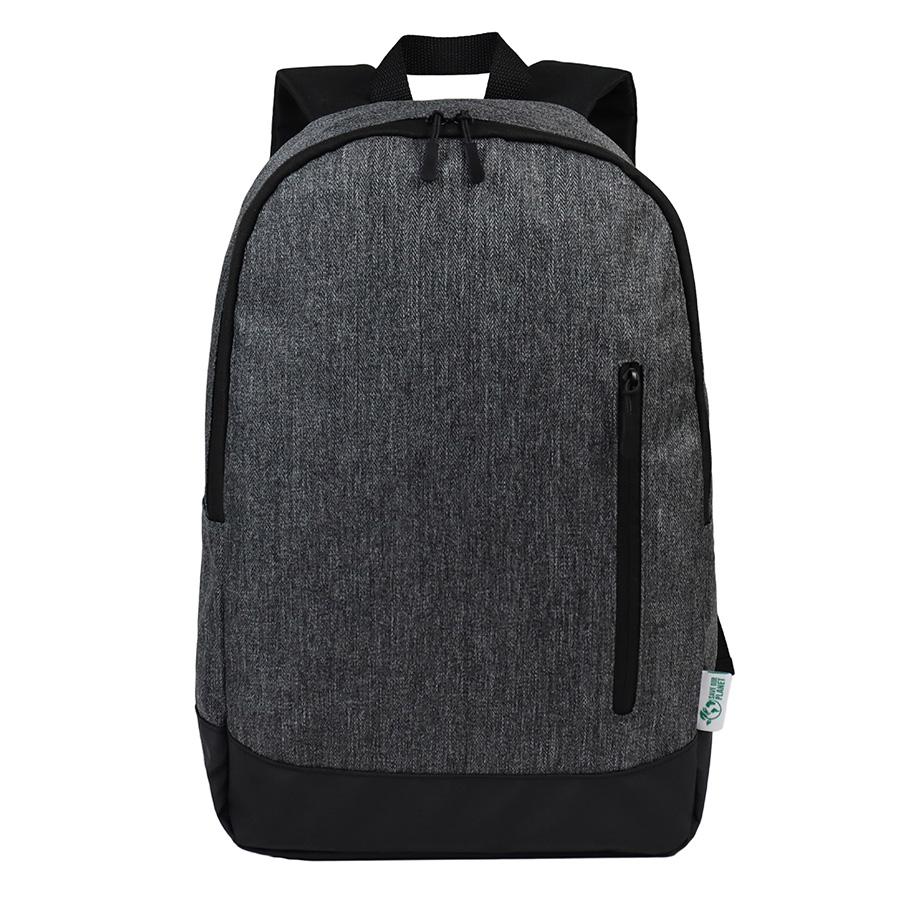 Mochila modelo "Look", fabricada en tela reciclada RPET, con base de eco-cuero PU 210D y parte posterior de poliéster 600D/PVC. Incluye compartimento principal + bolsillo delantero lateral. Incluye forro interior de nylon negro. Correas ajustables.