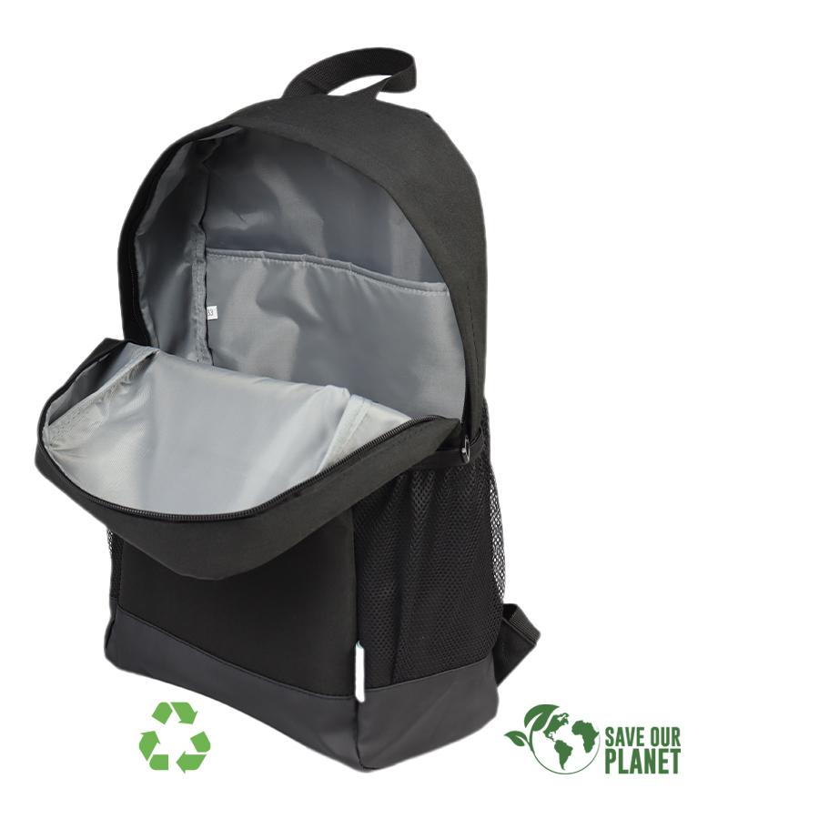 Mochila Porta-Notebook modelo "Rpet". Fabricada en material reciclado RPET y poliéster 250D/PVC. 5 cm. Incluye compartimento interior reforzado y acolchado para Laptop, bolsillo delantero y 2 bolsillos laterales con malla.