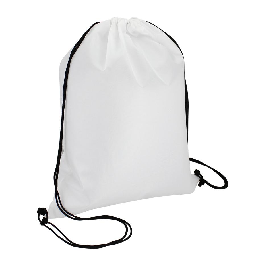 Mochila simple de 210D/PU poliéster, con tiras de cordón negro. Color blanco ideal para imprimir en sublimación.