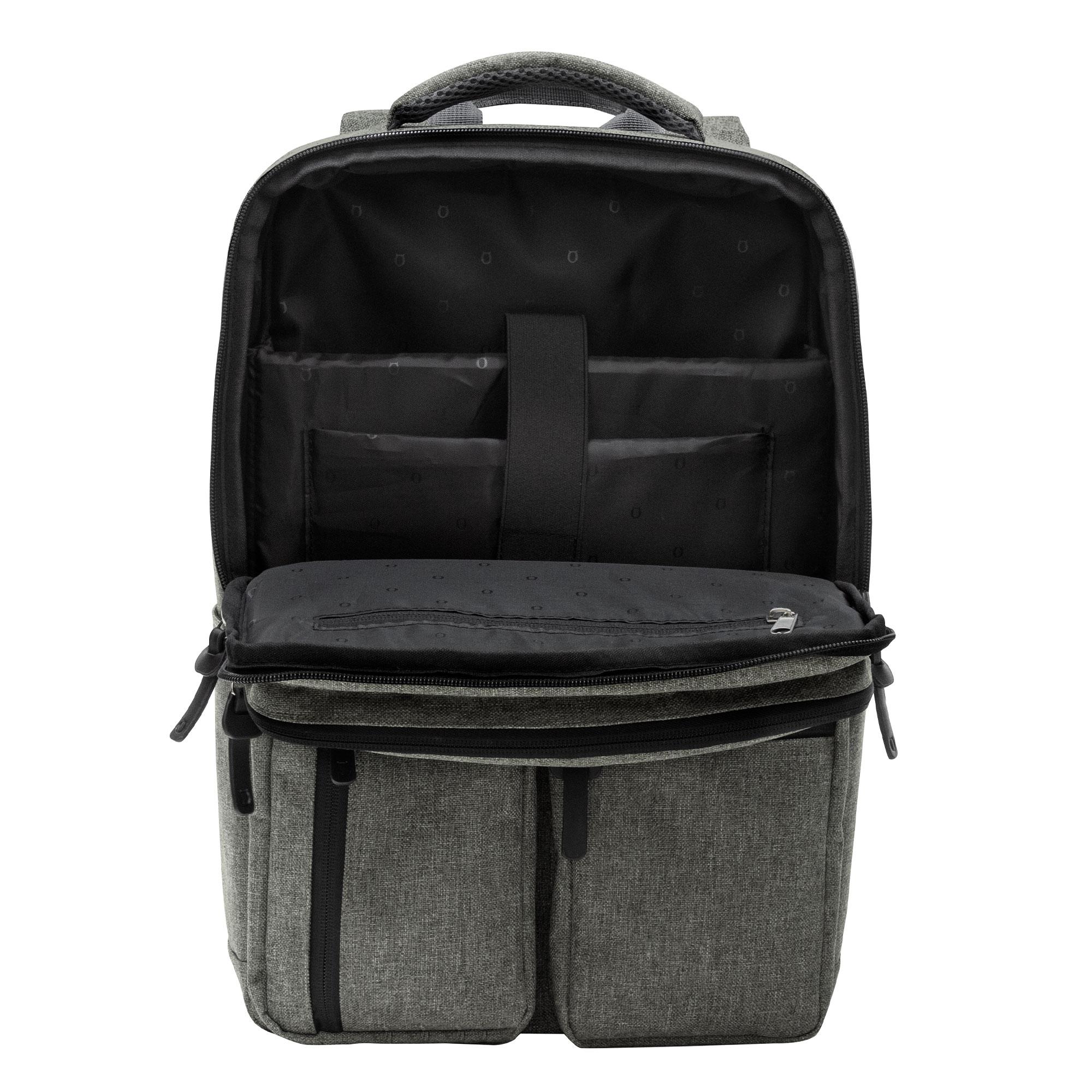 - Compartimento principal con bolsillos acolchados para notebook y tablet con cinta elástica de velcro. 3 bolsillos delanteros con cierre y 2 bolsillos laterales.