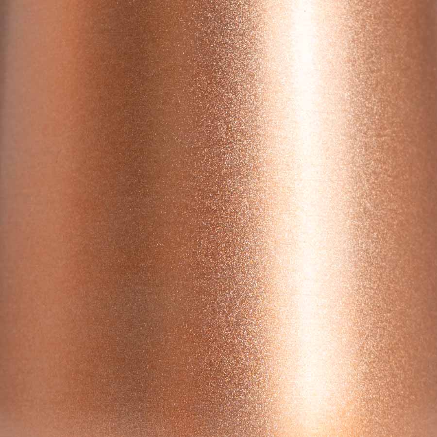 Mug metálico doble pared aislante, interior plástico PP, exterior Acero inoxidable 201 SS recubierto con pintura POWDER COAT color cobre. Producto BPA FREE, para el contacto con líquidos y alimentos. Fondo de silicona negra ABS anti-deslizante. Tapa removible de plástico PS Crystal Clear con sello cilíndrico de silicona. Presentación en bolsa PP + caja de regalo de cartón negro.