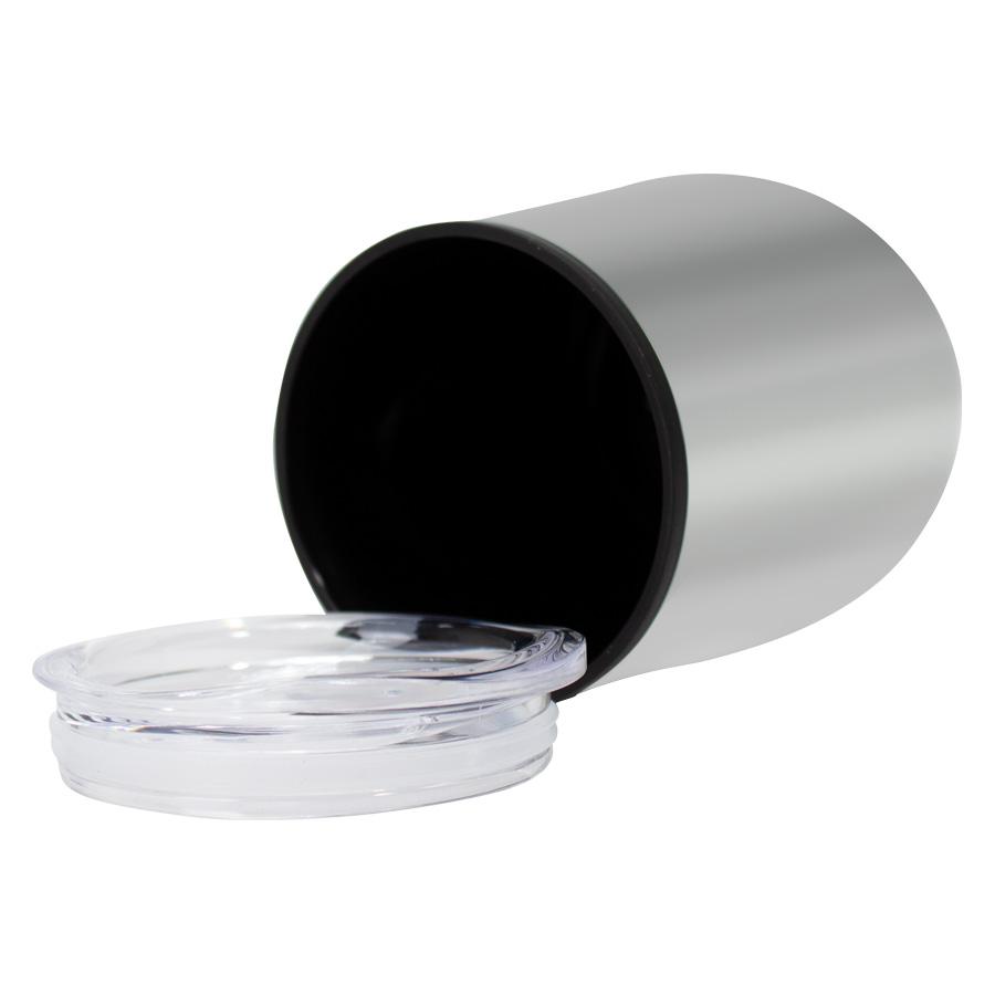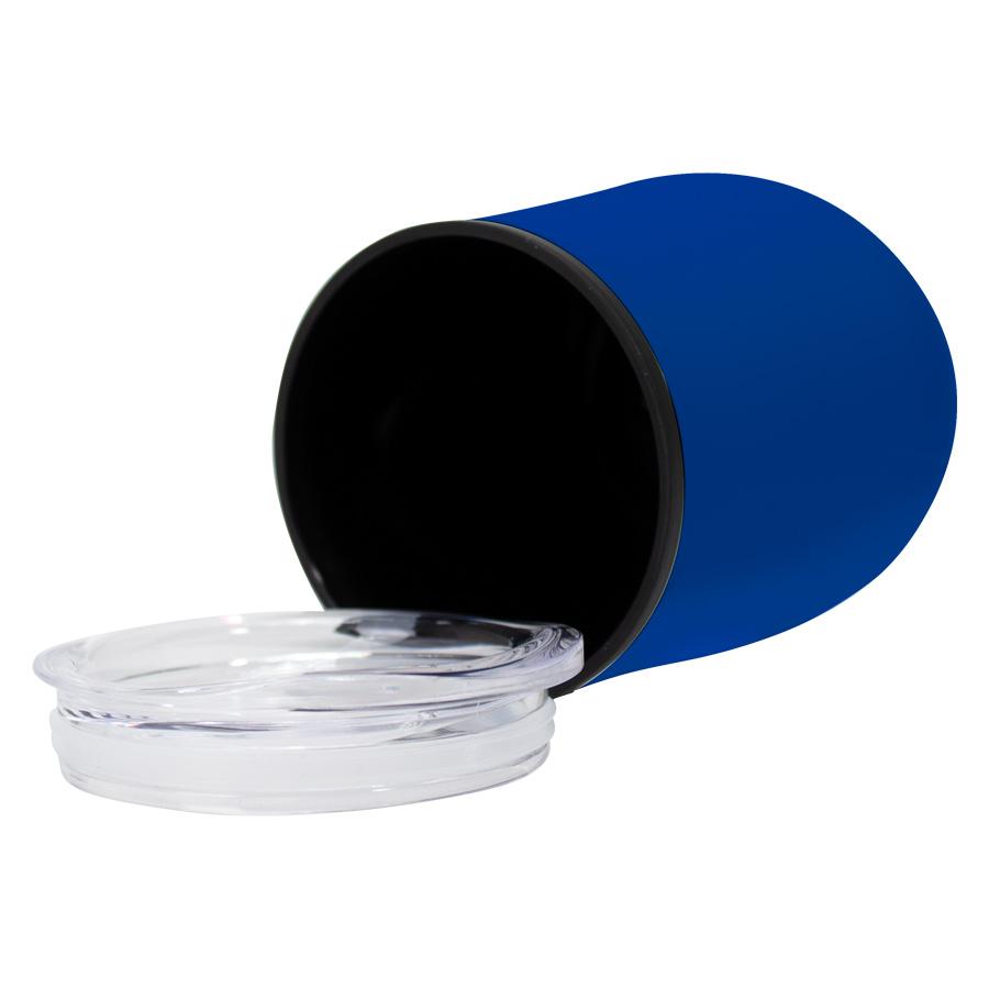 Mug metálico doble pared aislante, interior plástico PP, exterior Acero inoxidable 201 SS, recubierto con pintura POWDER COAT, modelo "Synna". Producto BPA FREE, para el contacto con líquidos y alimentos. Fondo de silicona negra ABS anti-deslizante. Tapa removible de plástico PS Crystal Clear con sello cilíndrico de silicona. Presentación en bolsa PP + caja de regalo de cartón negro.