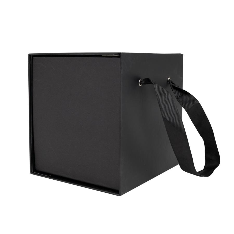 Presentación: Caja de Regalo de Cartón lacado negro con asas de poliéster negro.