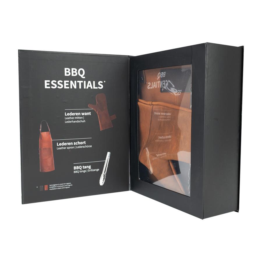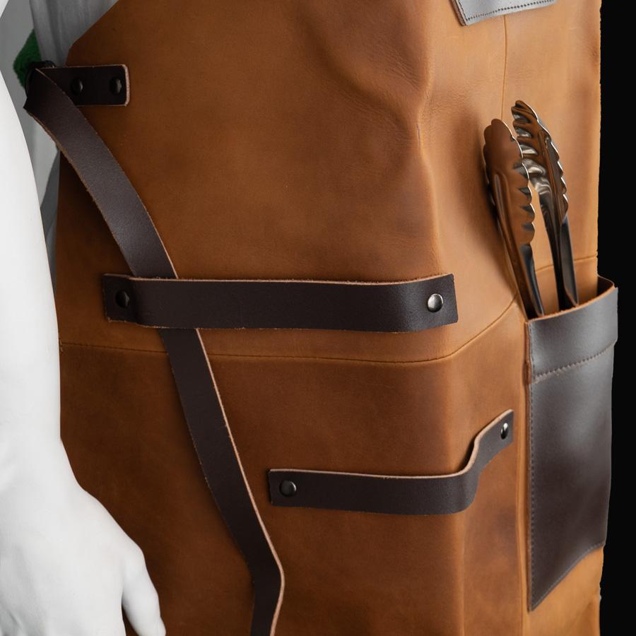 Un regalo fuera de serie. Deluxe set de Asador, contiene Pechera de Asador BBQ en cuero curtido, envejecido y suavizado 100% genuino color café cognac, con cintas y porta-accesorios de Cuero 100% genuino color café oscuro. Remaches de acero envejecido y 2 bolsillos delanteros de 22 x 18 cm. y 18 x 14 cm. Rectángulo para logo de 10 x 5 cm. Contiene además largo mitón de Asador BBQ en cuero curtido, envejecido y suavisado 100% genuino color café cognac y tenazas de Acero inoxidable. Presentación en elegante caja de regalo de cartón negro con ventana de mica transparente y gráfica a todo color con descripción de los elementos del set.