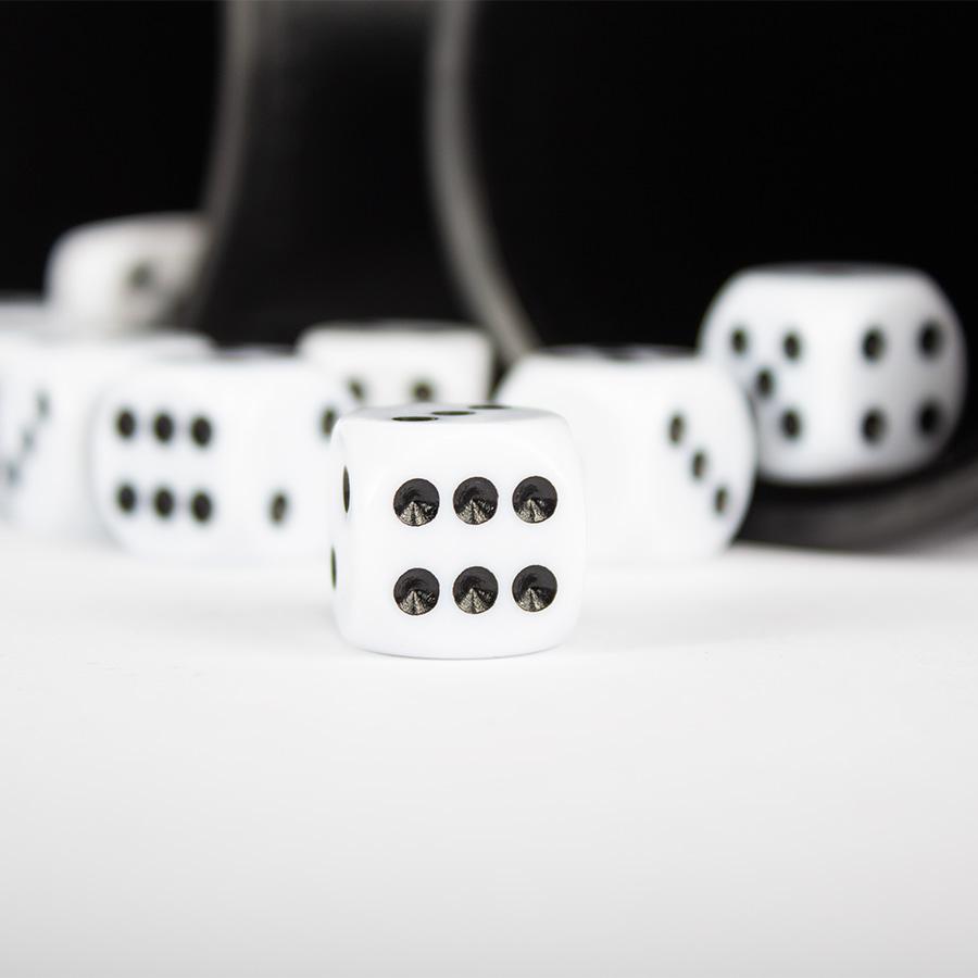 Set de 6 cachos de PU negro, presentados en bolsa. Incluye 30 dados blancos (5 dados por cada cacho).