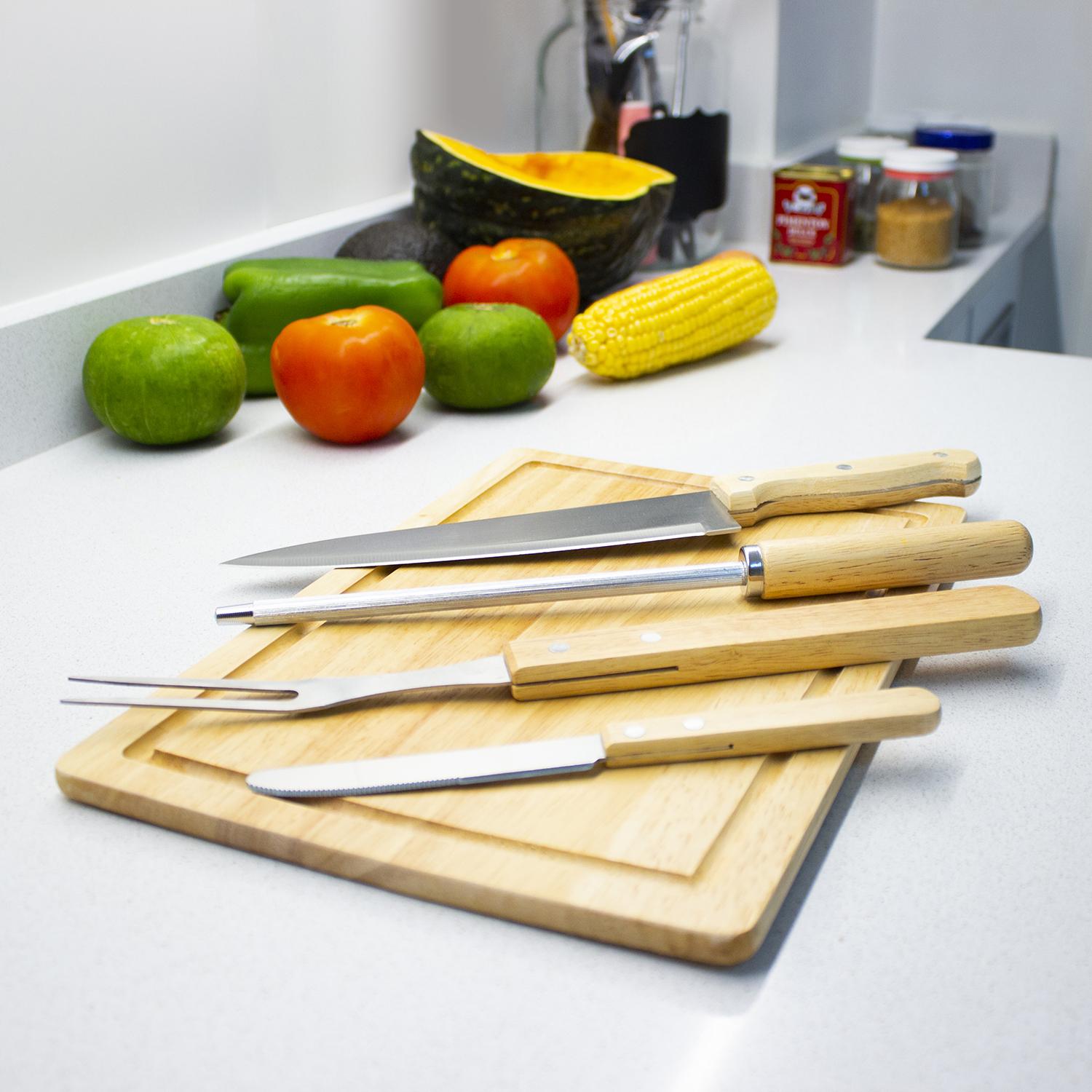- Set de asado de 5 piezas: Tabla de bambú 32,5 x 21,5 x 1,1 cm.