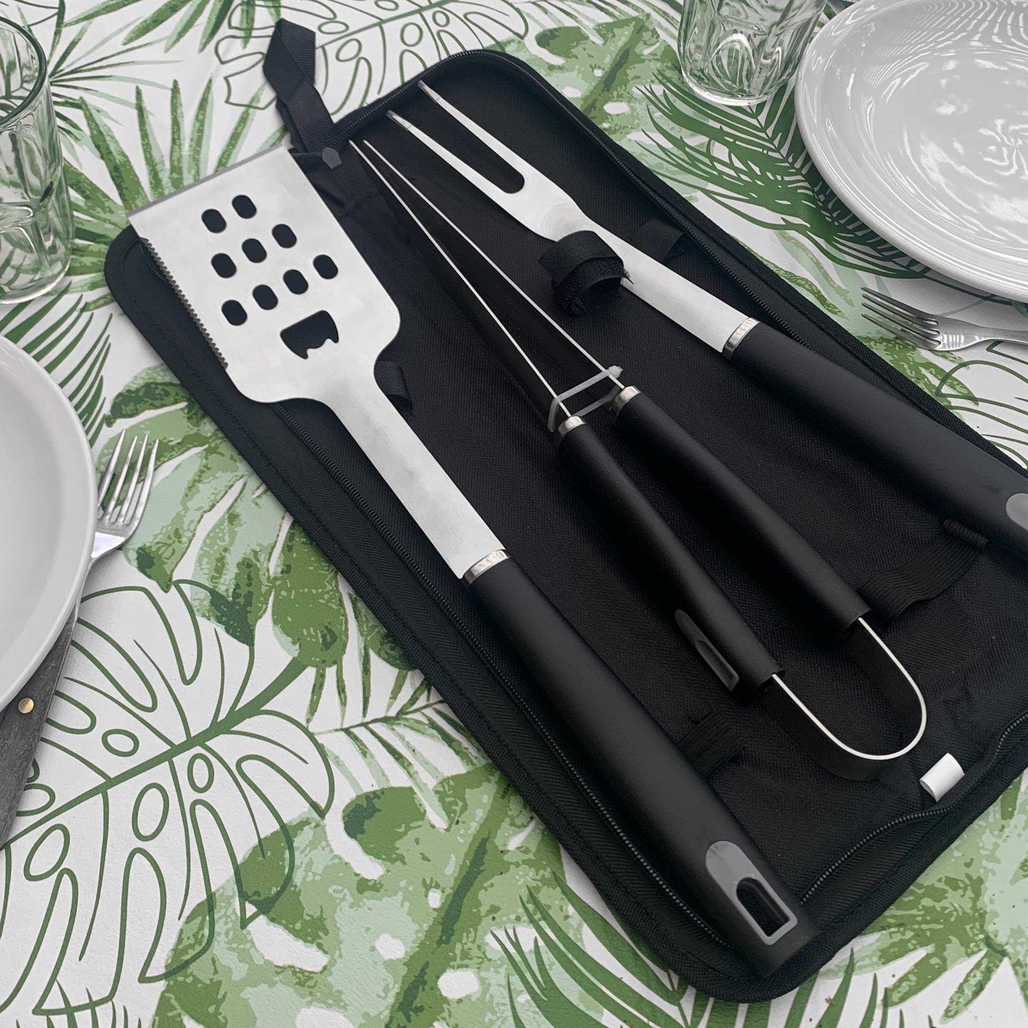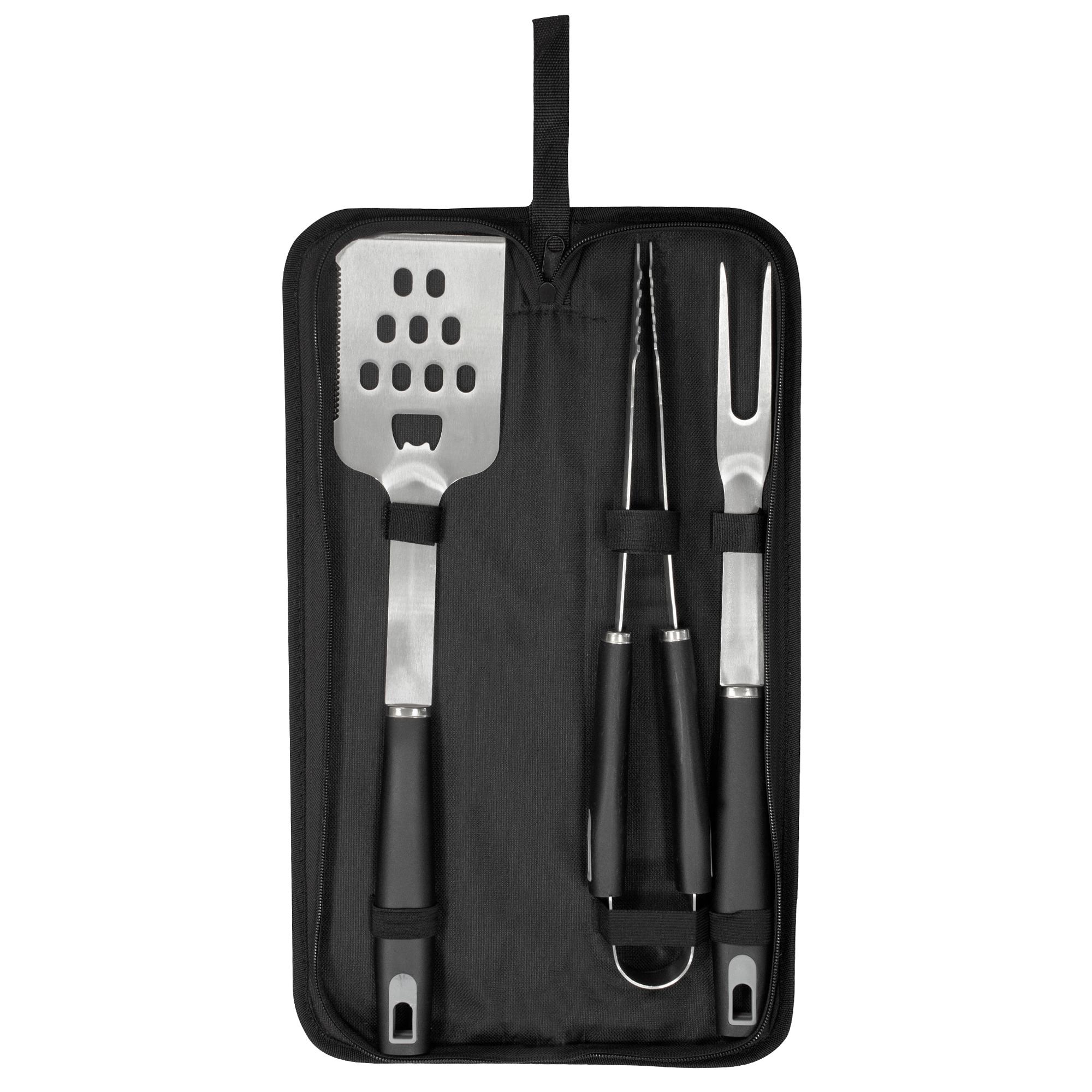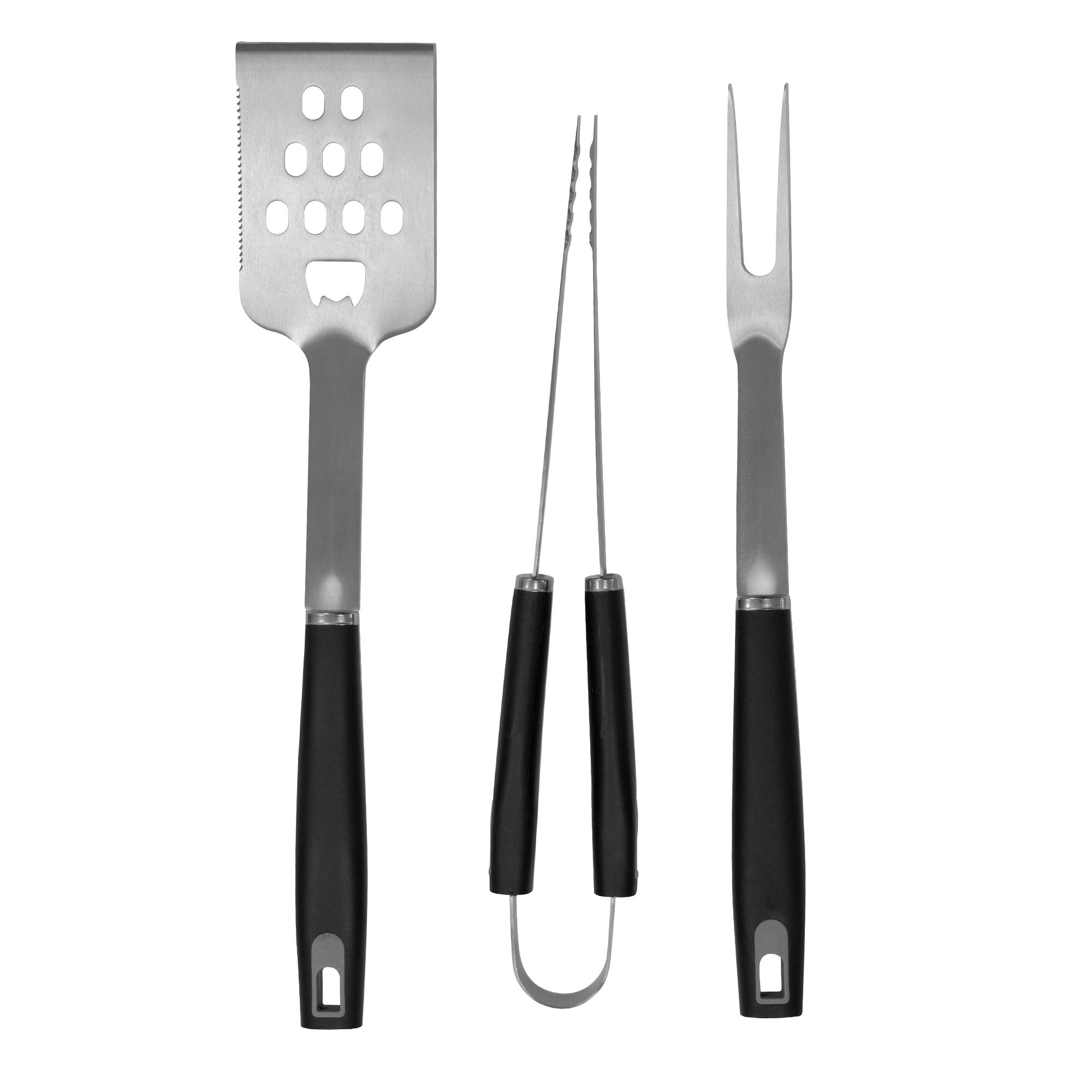 - Contiene 3 utensilios de acero inoxidable 420: tenedor de 135g y 41 cm de largo; pinza de 275g y 39 cm de largo; y espátula de 225g y 43 cm de largo, todos con mango de polipropileno en color negro.