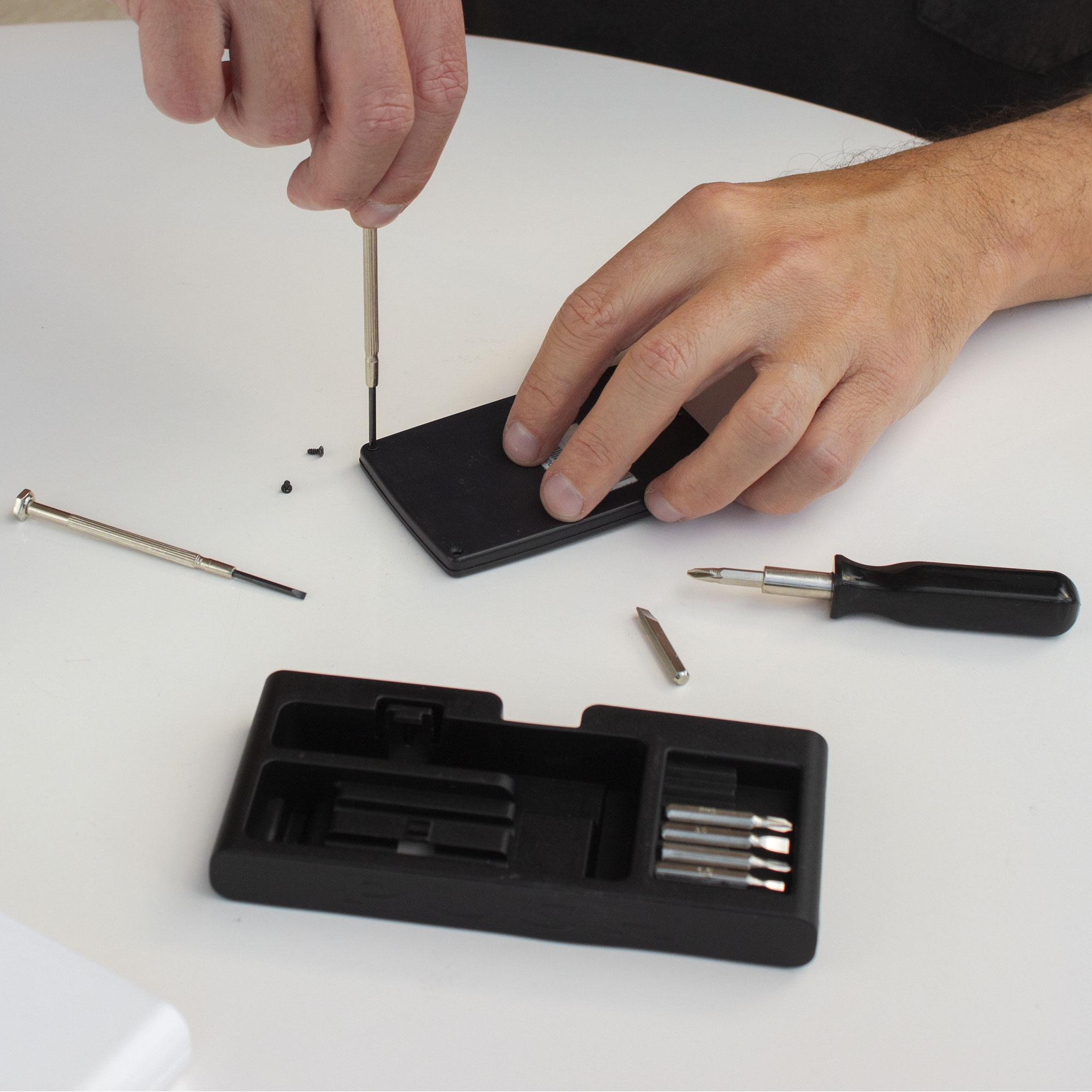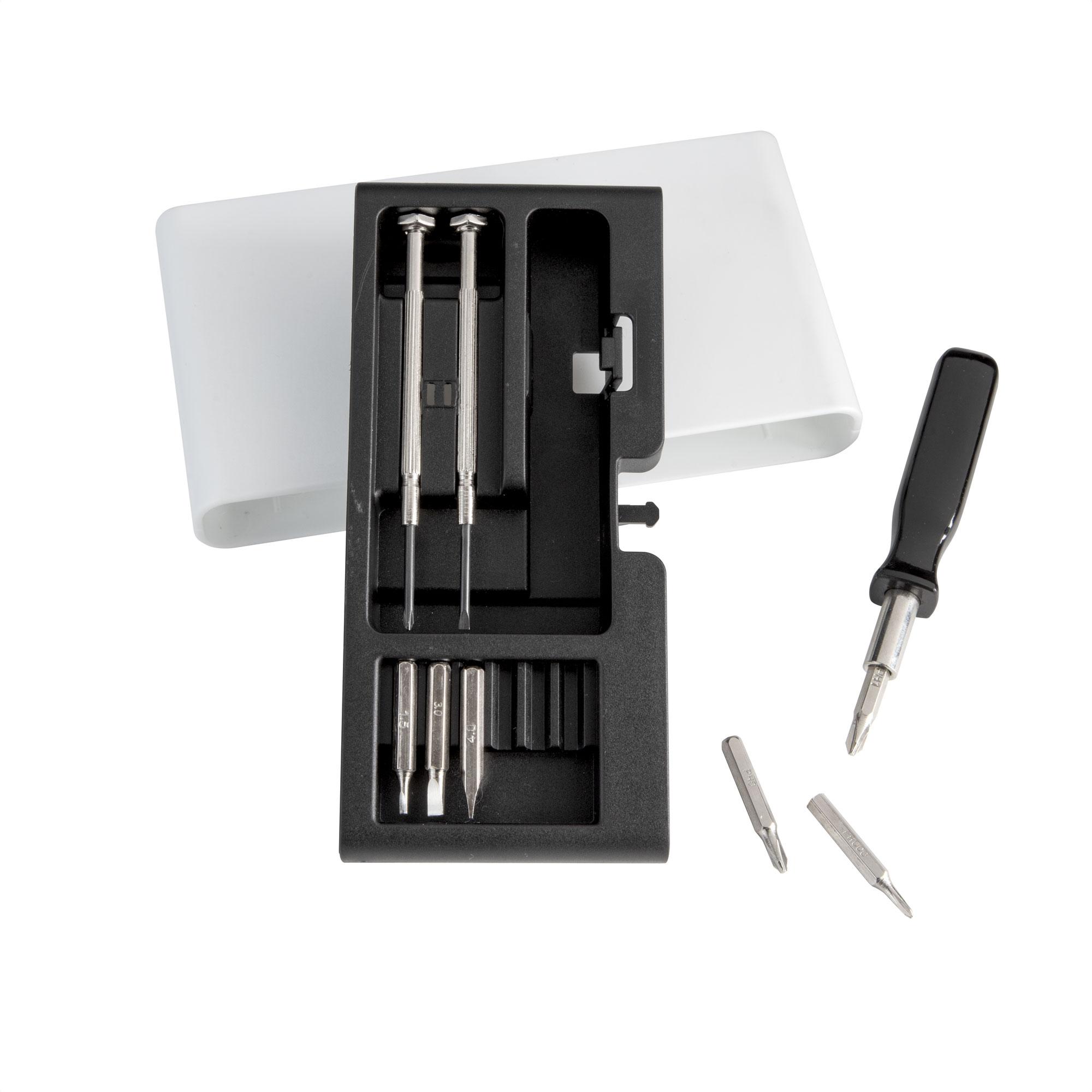 - Incluye: 1 mango con punta imantada, 6 puntas diferentes (3 planas: 1,5 ; 3 y 4 mm. y 3 cruz: 0000, 0 y 1mm.) y 2 destornilladores de precisión (1 plano y 1 cruz).