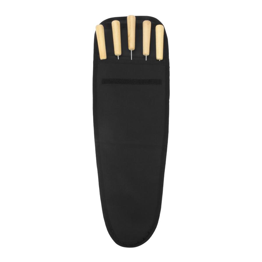 Set de 5 fierros para anticuchos con mango de madera, en estuche de tela raquelada. Fácil para bordar o imprimir.
