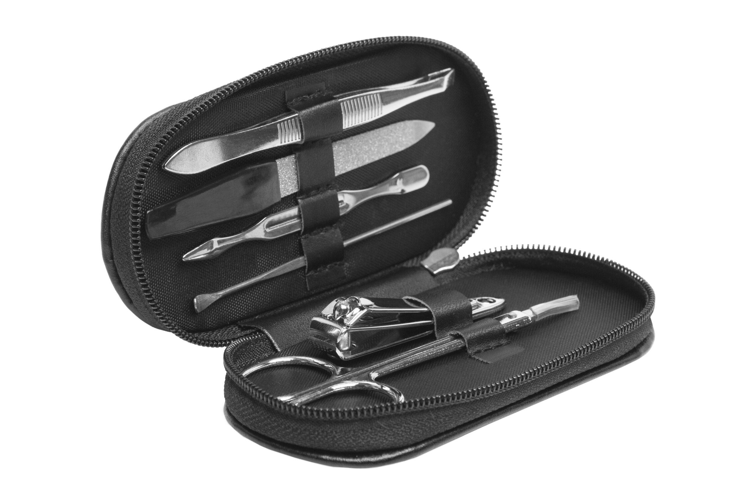 - Estuche organizador con cierre que contiene: tijera, alicate, 2 limpia cutículas, lima metálica y pinza de depilar.