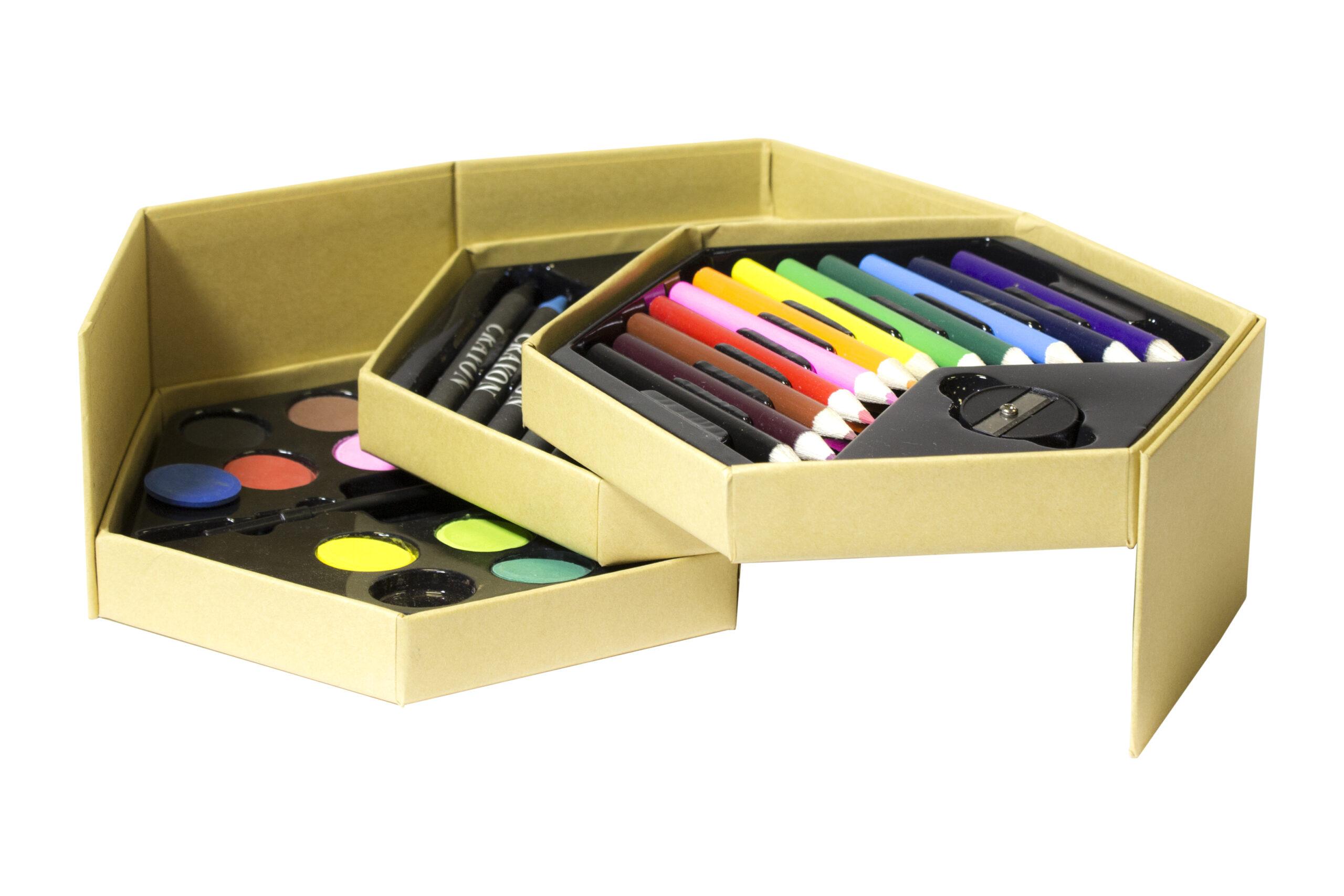 - Set de pinturas en forma de hexágono. 12 lapices de colores, 1 sacapuntas, 12 crayones, 1 goma de borrar, 12 acuarelas y 1 pincel.