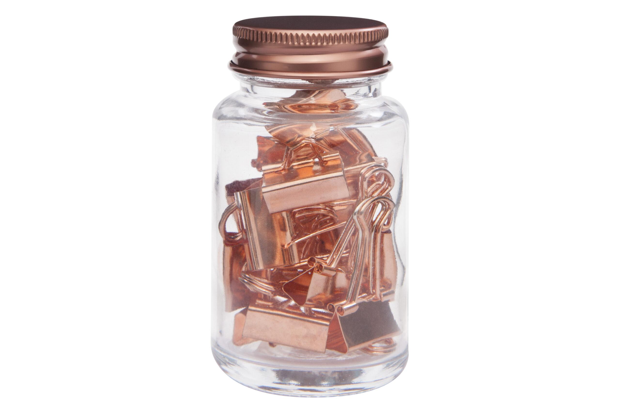 - Set de sujeta papeles metálicos en frasco de vidrio con tapa metálica.
