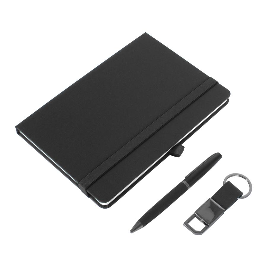 Set Ejecutivo de Escritorio. Incluye cuaderno negro tapa dura texturada, tamaño A5 de 14.6 x 21. 1.5 cm con 96 hojas lineadas amarillo claro, cierre elasticado negro, llavero ejecutivo con mosquetón, anillo y cuerpo metálico cromado y cinta de PU texturado y finalmente Bolígrafo ejecutivo metálico, cuerpo negro opaco y escritura azul. Presentación en elegante caja con tapa, de cartón piedra texturado negro, con interior cama de terciopelo negro, con troquelados para cada elemento. Un gran regalo para nivel ejecutivo.
