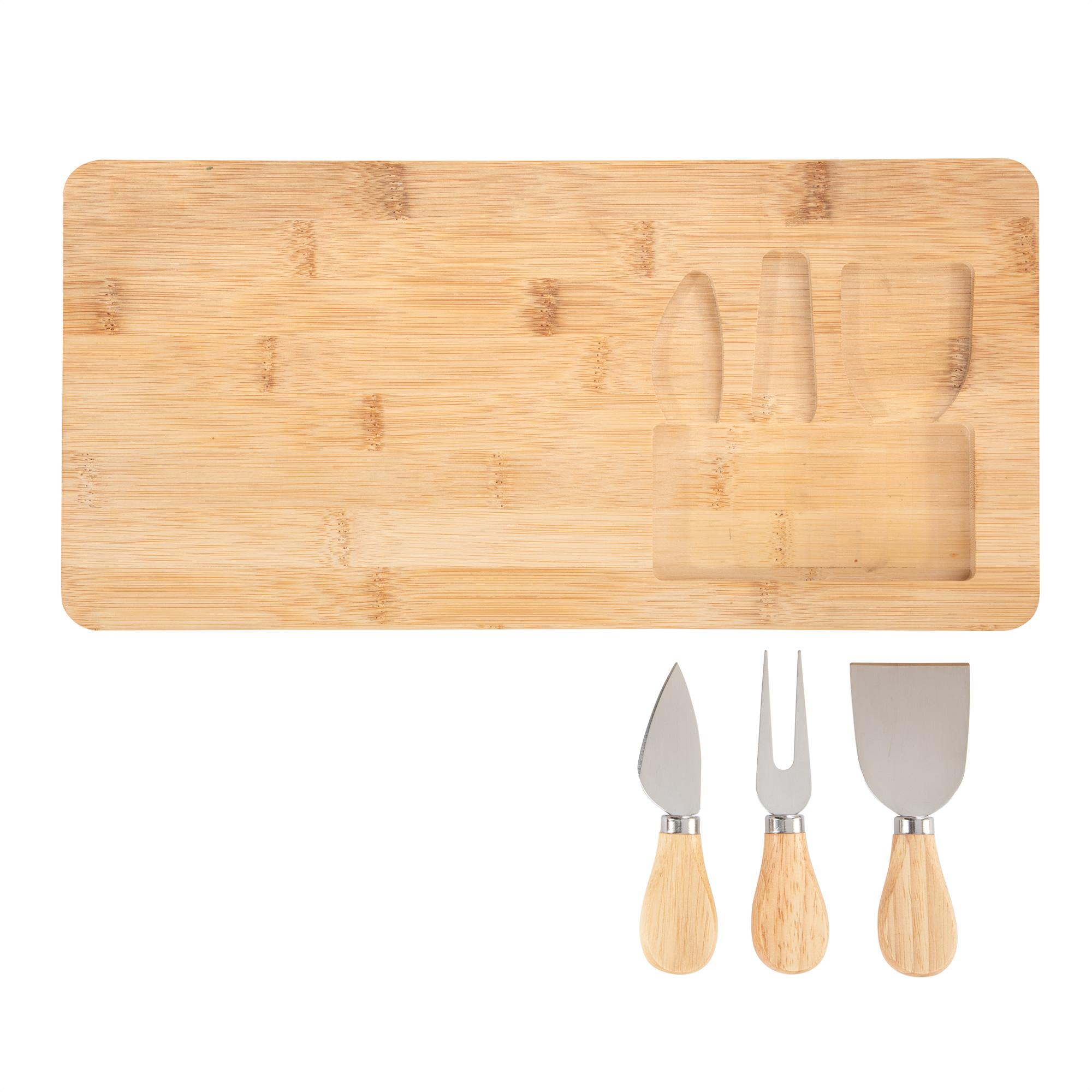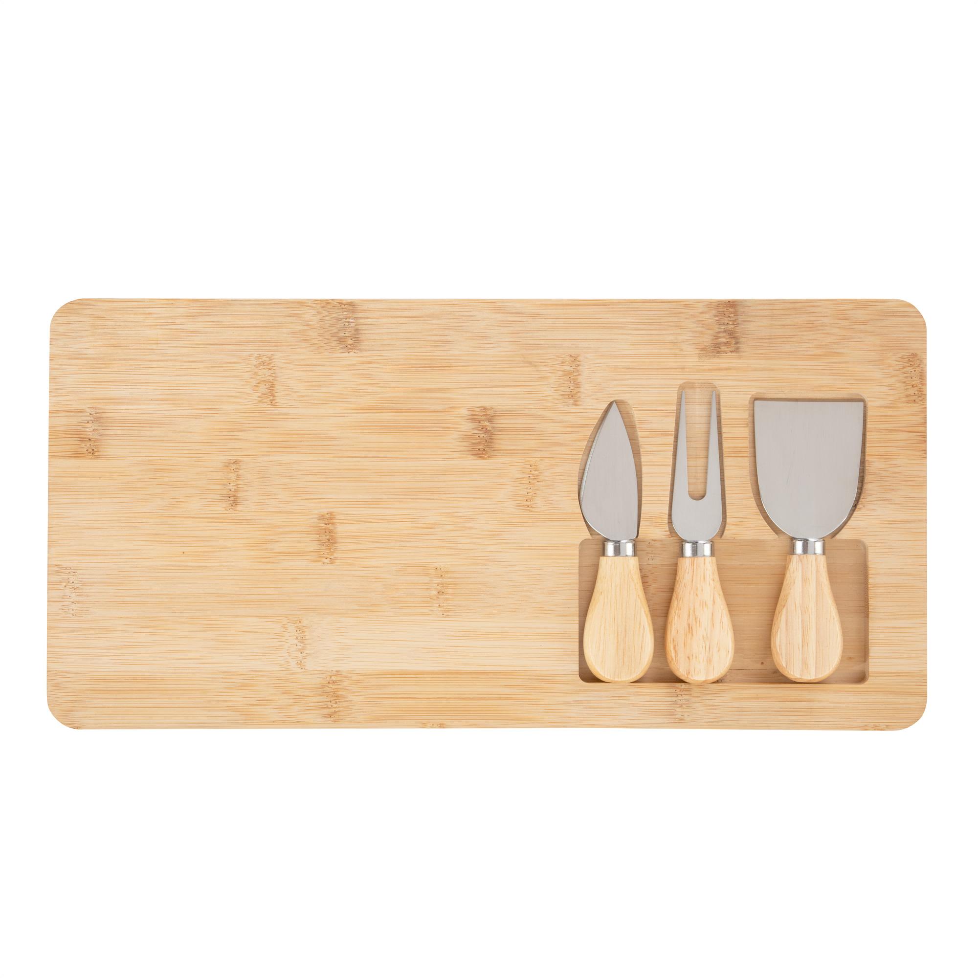 • Tabla de bambú con set de 3 utensilios de acero inoxidable 420 con mango de madera de caucho: 1 cuchillo, 1 tenedor y 1 espátula.