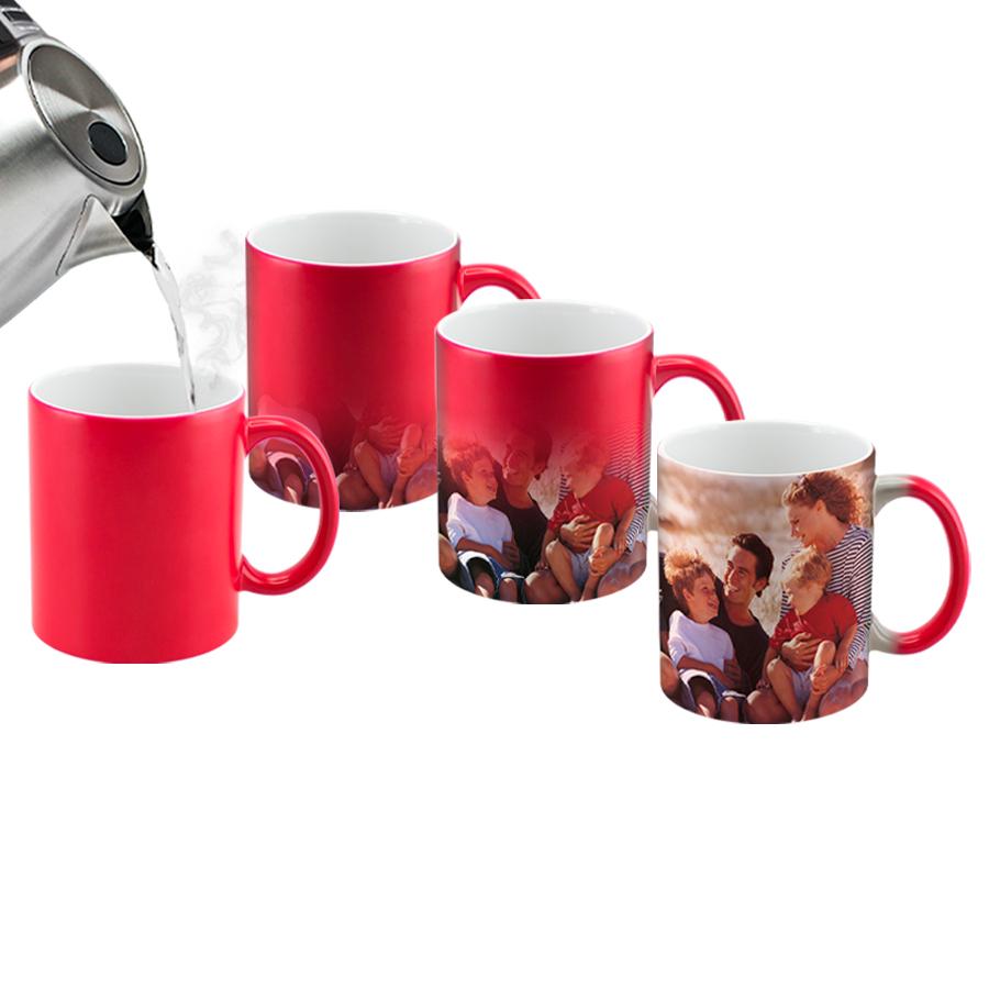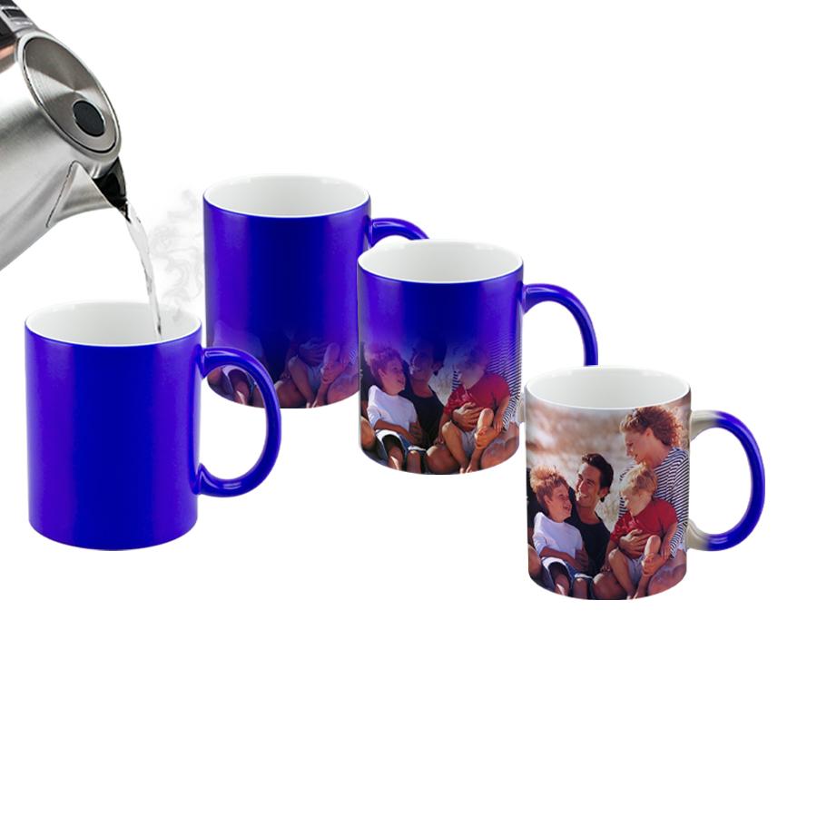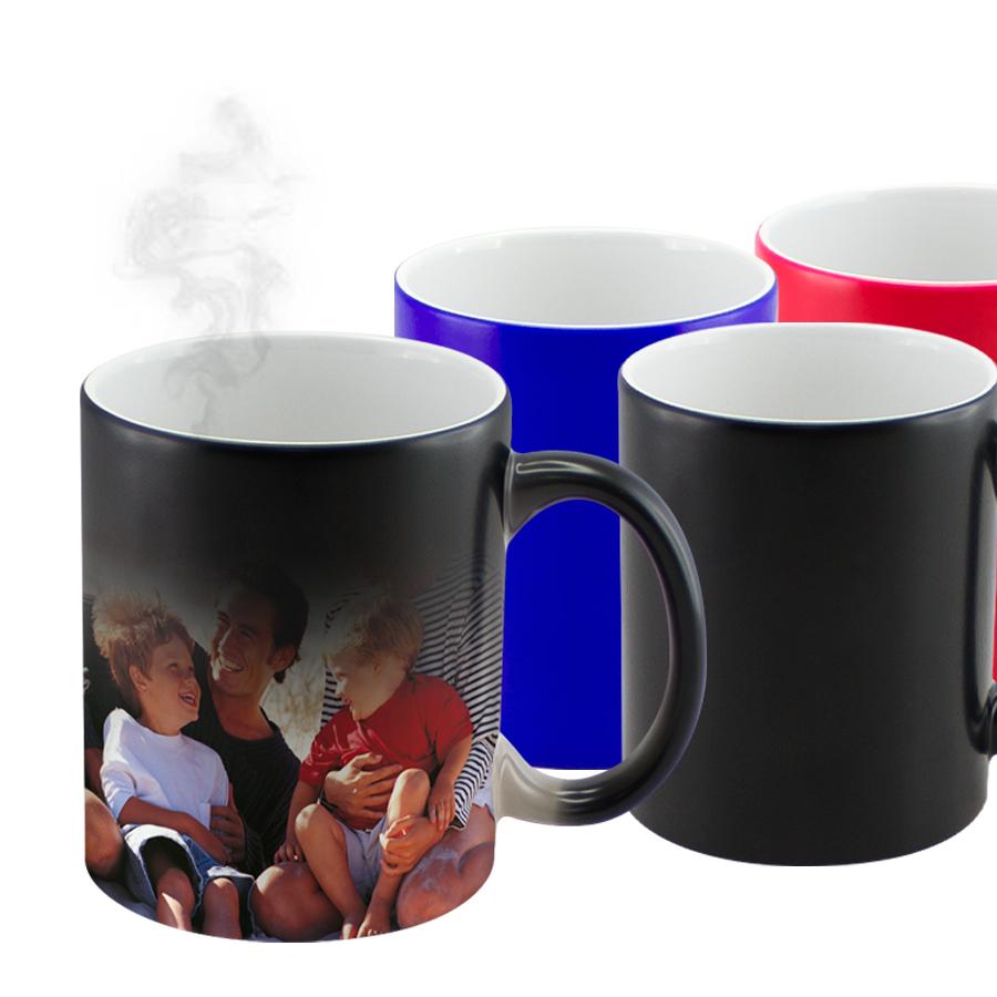 Tazón cerámico mágico color Mate (opaco) para Sublimación. Contiene polímero termo-reactor en la pared exterior del tazón. A primera vista parece un tazón negro estándar, pero en contacto con líquido caliente, la imagen sublimada comienza a aparecer nítidamente en el tazón. Una vez que el líquido se enfría, la imagen se desvanece y vuelve a aparecer el negro mate. Incluye caja blanca de Cartón.