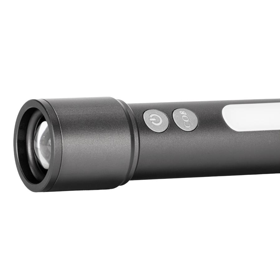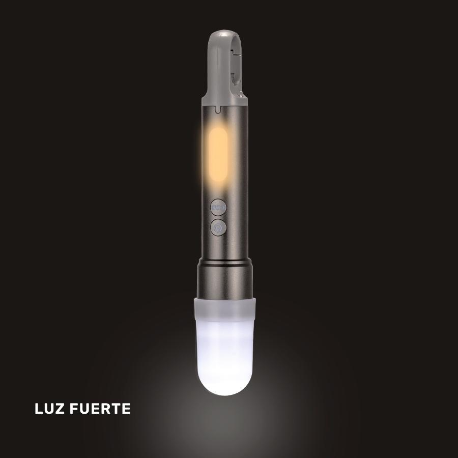 Linterna táctica recargable de Aluminio con 15 diferentes funciones. Luz LED principal con 5 funciones o intensidades: 100%-50%-25%-estroboscópico-SOS. Lámpara lateral con 4 funciones: 100%-50%-luz roja frecuente y estroboscópica. Control de apertura de foco. Incluye cápsula blanca para convertir la linterna en lámpara, incluye 3 filtros de Incluye Mosquetón para colgar. Incluye cable de carga USB-Tipo C y ranura Tipo C para cargar la batería interna. Características técnicas: 1) Batería de litio 18650 2) Voltaje: 3.7 V 3) Luminosidad: 1000 Lumen 4) Carga: 2000 mAh 5) Potencia: 20W 6) Alcance de Proyección: 150m 7) Tiempo de Carga: 5 horas aprox. Presentación en caja de regalo de cartón kraft.